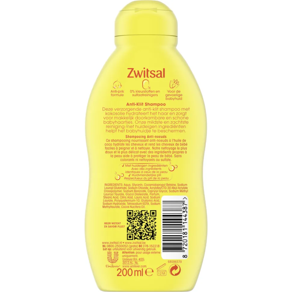 - Zwitsal Baby Anti-Klit Shampoo met anti-prik formule hydrateert de haren