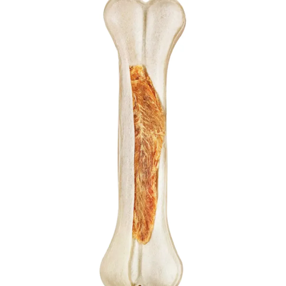 Geperste kauwbotten met kippenvlees – voor langer kauwplezier. Lekker kippenvlees gewikkeld in stevige premium runderhuid – de unieke combinatie van kauwbot en beloning.