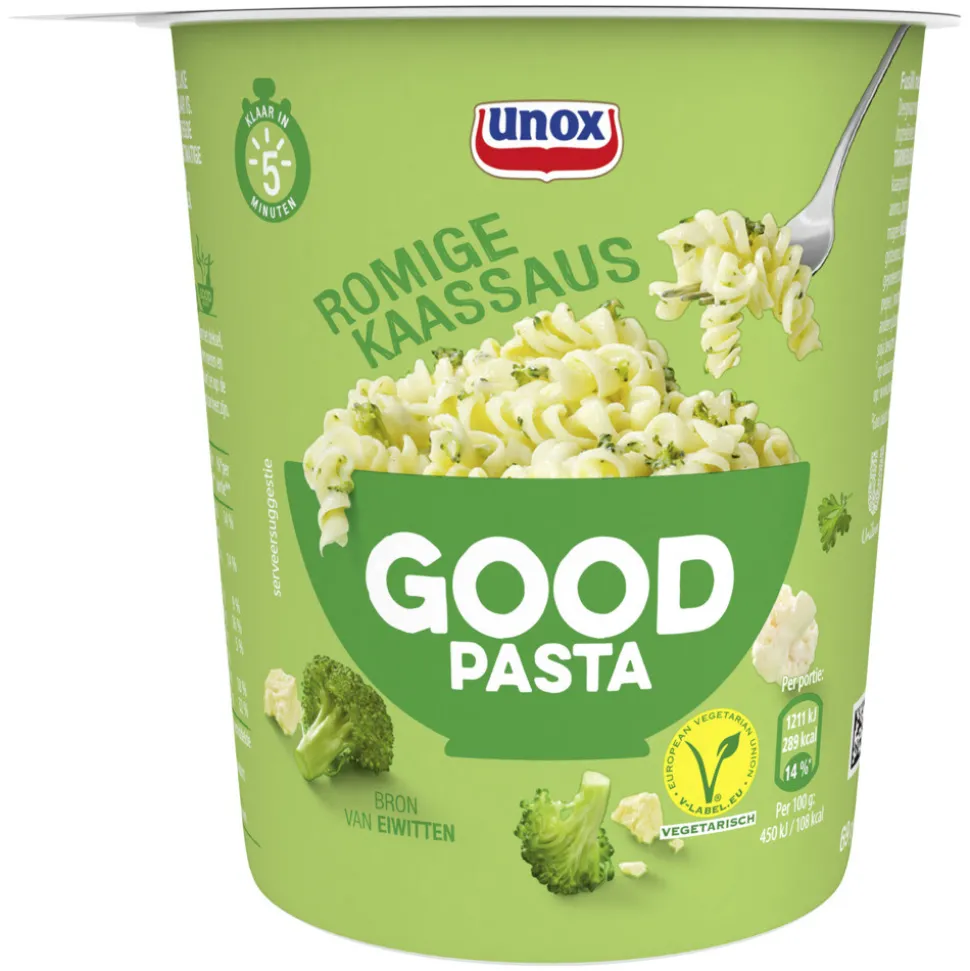 Unox Good Pasta Romige Kaassaus is een heerlijke pasta, rijk aan smaak. Deze variant van Unox Good Pasta is ook geschikt voor vegetariërs. Unox Good Pasta Romige Kaassaus zit in een handige pot en is klaar in 5 minuten. Dit lekkere tussendoortje is dus klaar in een handomdraai.
