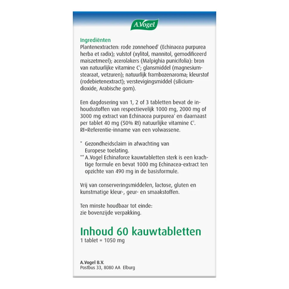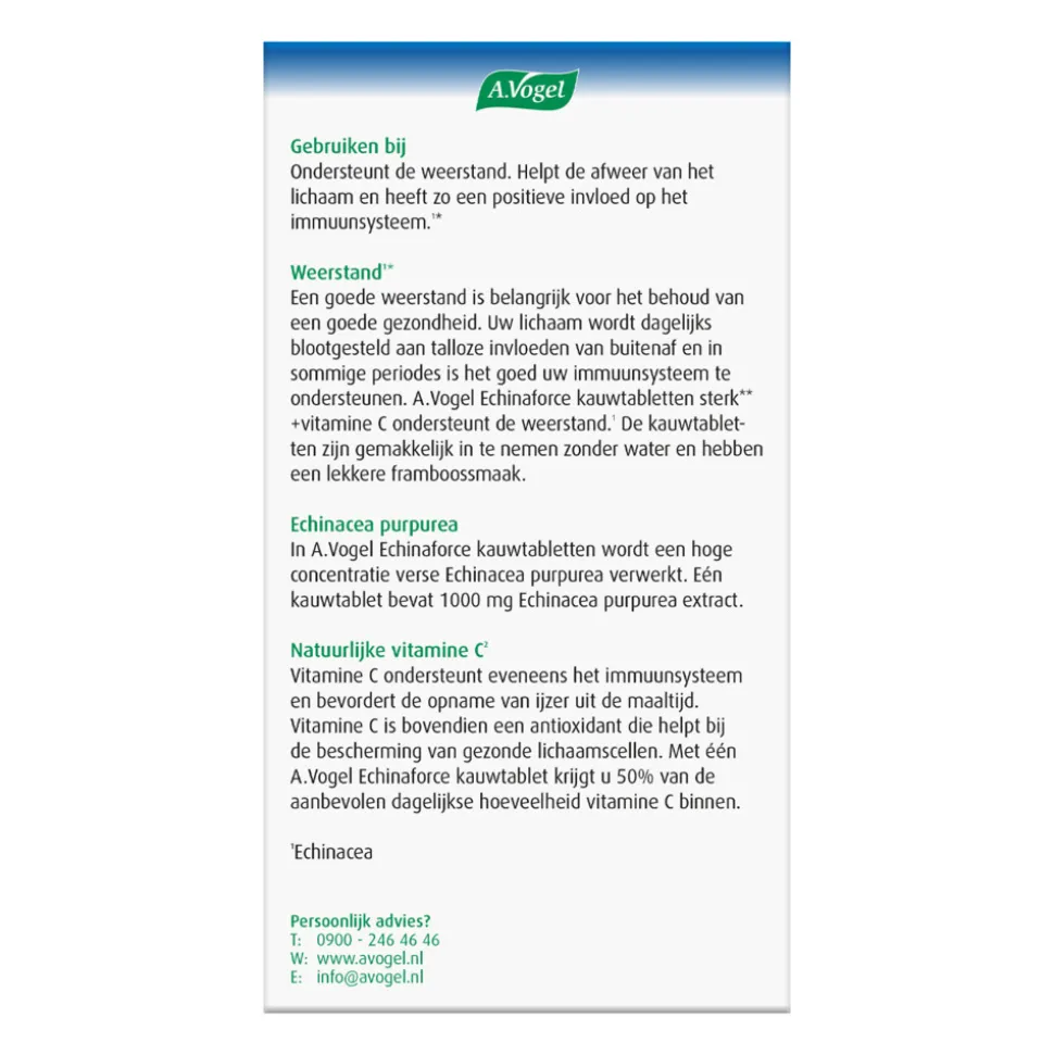 Echinaforce kauwtabletten sterk** van A. Vogel is een voedingssupplement met kruiden en vitamine. Echinaforce kauwtabletten sterk** bevat een hoge dosering Echinacea purpurea (rode zonnehoed) en vitamine C. De toegevoegde vitamine C maakt deze Echinaforce Sterk** bijzonder. Dit helpt onder andere bij de bescherming van gezonde lichaamscellen. A.Vogel Echinaforce kauwtabletten sterk**+ vitamine C ondersteunt de weerstand en helpt de afweer van het lichaam en heeft zo een positieve invloed op het immuunsysteem.1*. A.Vogel Echinaforce kauwtabletten sterk**+ vitamine C is vrij van conserveringsmiddelen, lactose, gluten en kunstmatige kleur-, geur- en smaakstoffen.