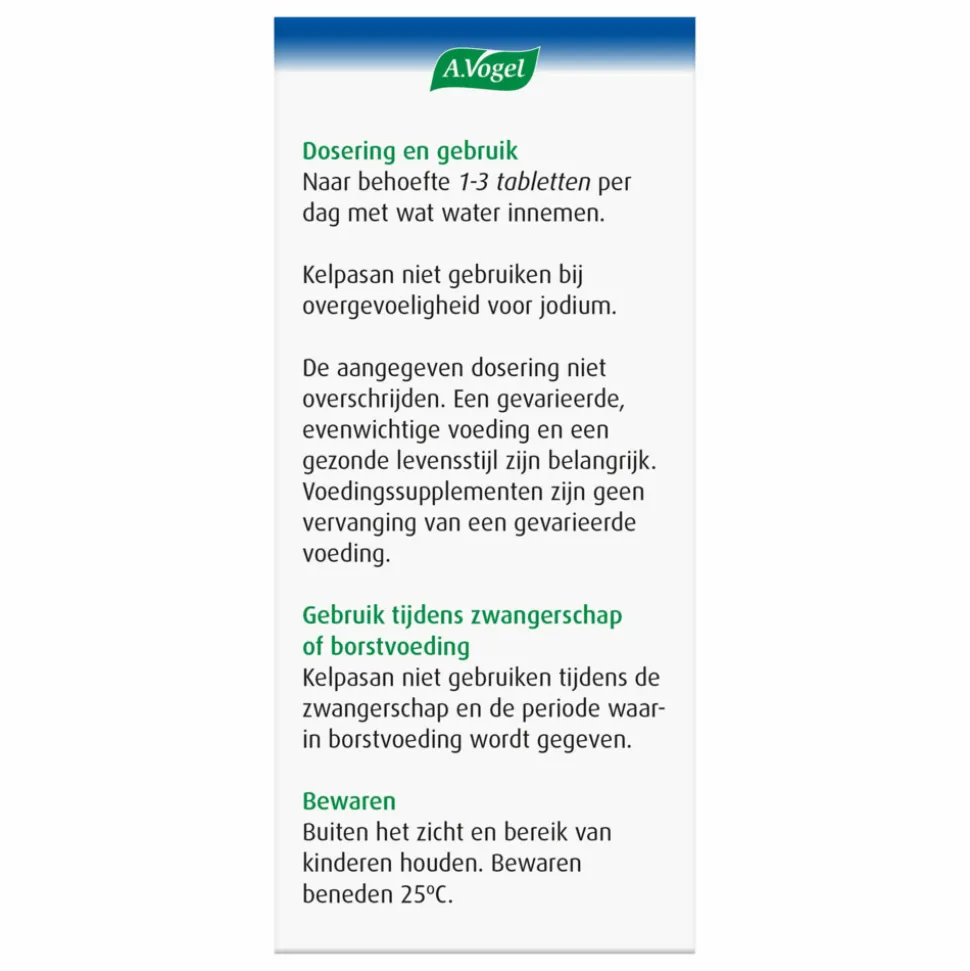 Jodium is een belangrijke bouwstof om de schildklier optimaal te laten functioneren en de stofwisseling te ondersteunen. Kelpasan van A.Vogel is een zuiver natuurlijk middel dat is gemaakt uit de unieke zeewiersoort Macrocystis pyrifera (grote kelp). Deze plant is van nature rijk aan jodium. 1 tablet bevat 50 µg jodium (komt overeen met 33% referentie-inname van een gemiddelde volwassene).