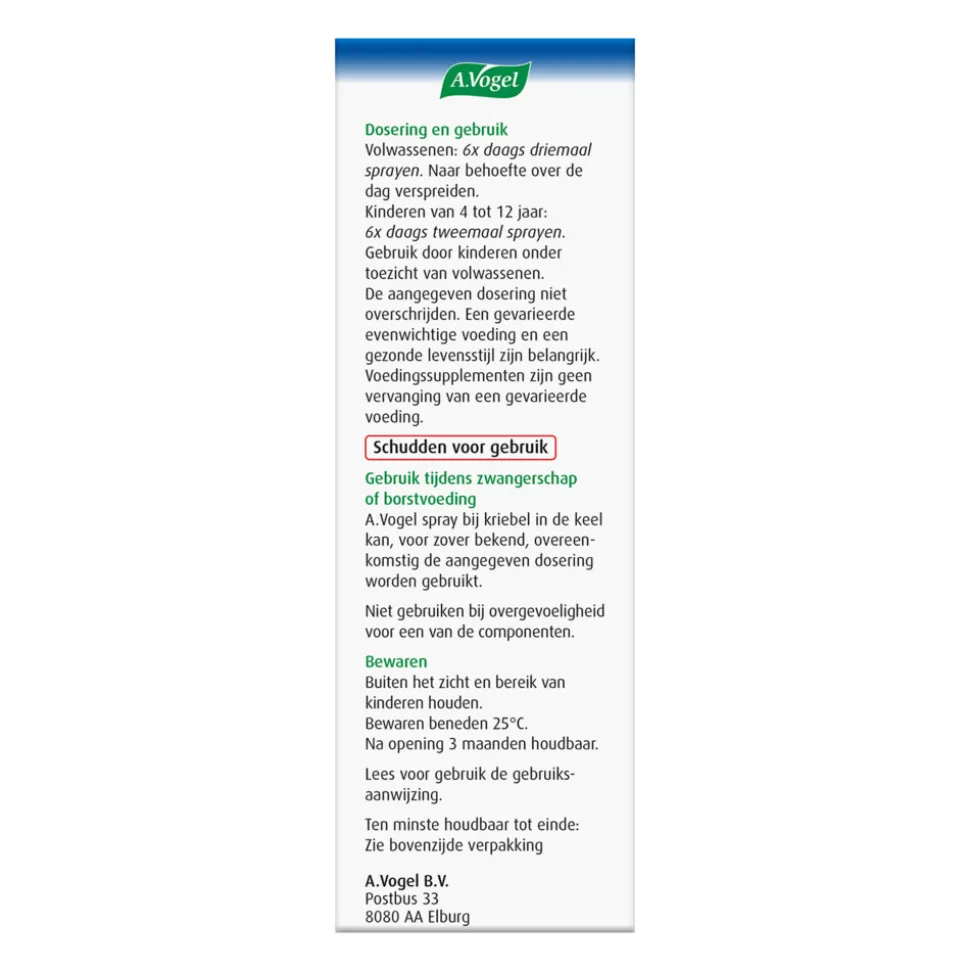 - Niet gebruiken bij overgevoeligheid voor een van de componenten. A.Vogel spray mag niet gebruikt worden door baby’s en peuters jonger dan 4 jaar.