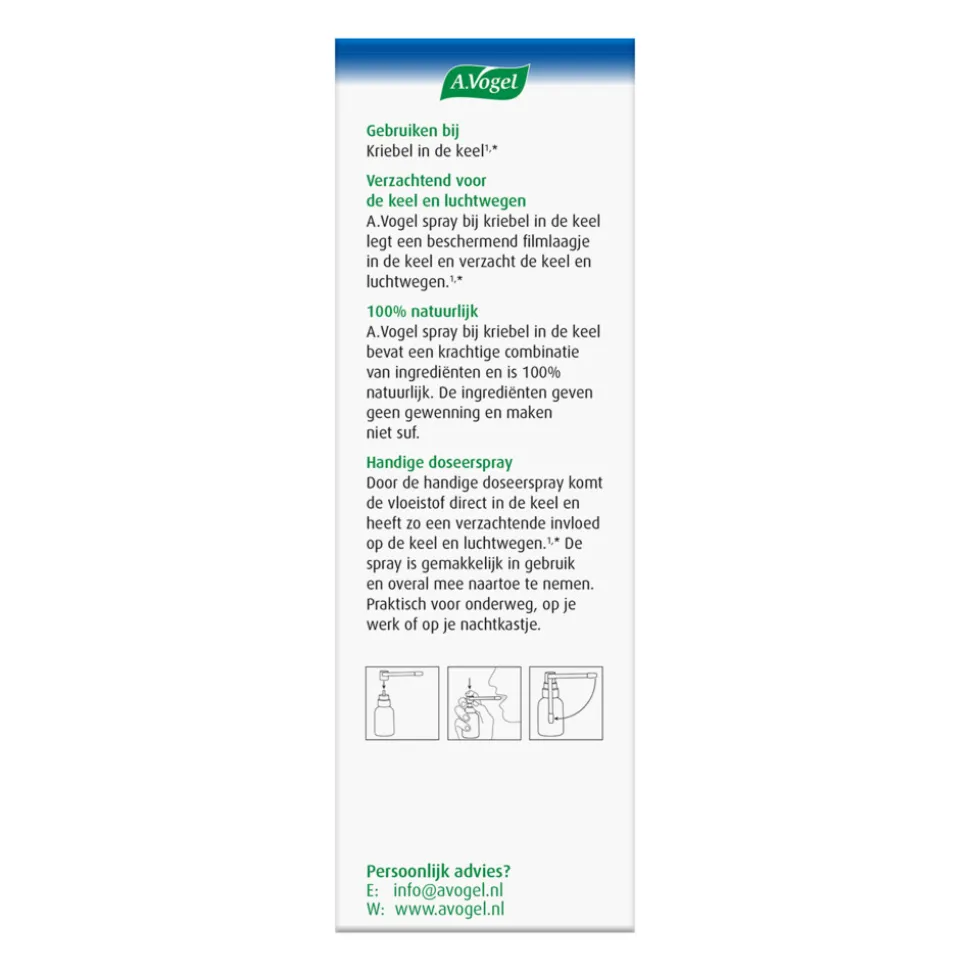 Medisch hulpmiddel A.Vogel Spray Kriebel in de Keel legt een beschermend filmlaagje in de keel waardoor dit hoeststillend en verzachtend werkt. Tevens zorgt het ervoor dat de geïrriteerde slijmvliezen niet verder worden geprikkeld. A.Vogel spray bevat een krachtige combinatie van ingrediënten en is 100% natuurlijk. De spray is geschikt voor volwassenen en kinderen vanaf 4 jaar, gemakkelijk in gebruik en overal mee naartoe te nemen. Praktisch voor onderweg, op je werk of op je nachtkastje.