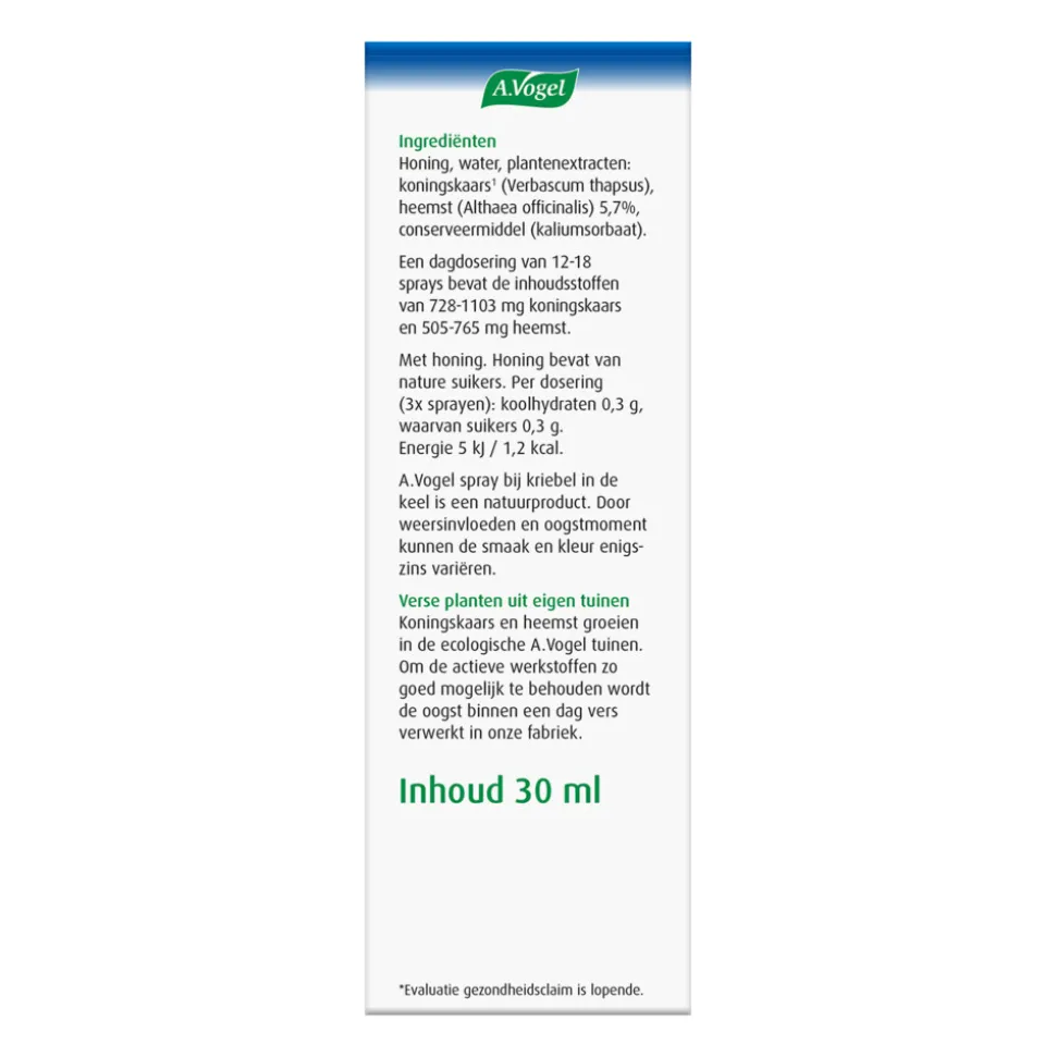 Mel, Aqua, Verbascum thapsus extract, Althaea officinalis radix extract, Potassium sorbate. Met honing. Honing bevat van nature suikers. Per dosering (3x sprayen): koolhydraten 0,3 g, waarvan suikers 0,3 g. Energie 4,9 kJ / 1,2 kcal.