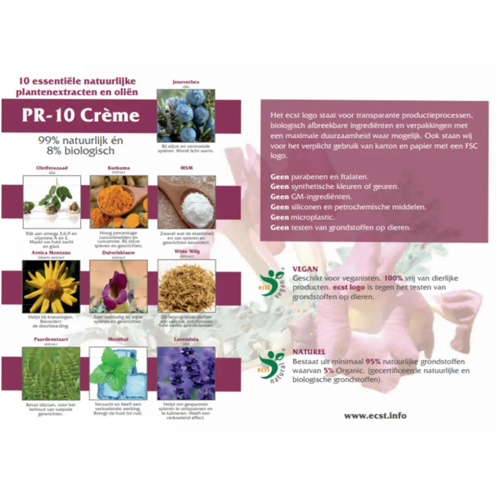 Activo PR-10 Crème is voor 99% natuurlijk en voor 8% biologisch. Activo PR-10 Crème is gemaakt van10 essentiële natuurlijke plantenextracten en oliën. Activo PR-10 Crème mag het ecst logo voeren. De creme en groendstoffen zijn niet getest op dieren en is daarom geschikt voor Vegan.