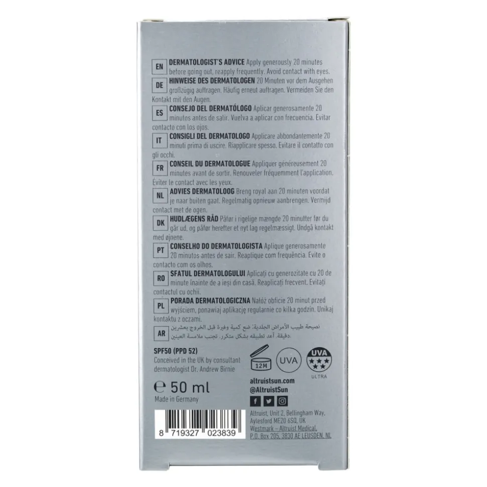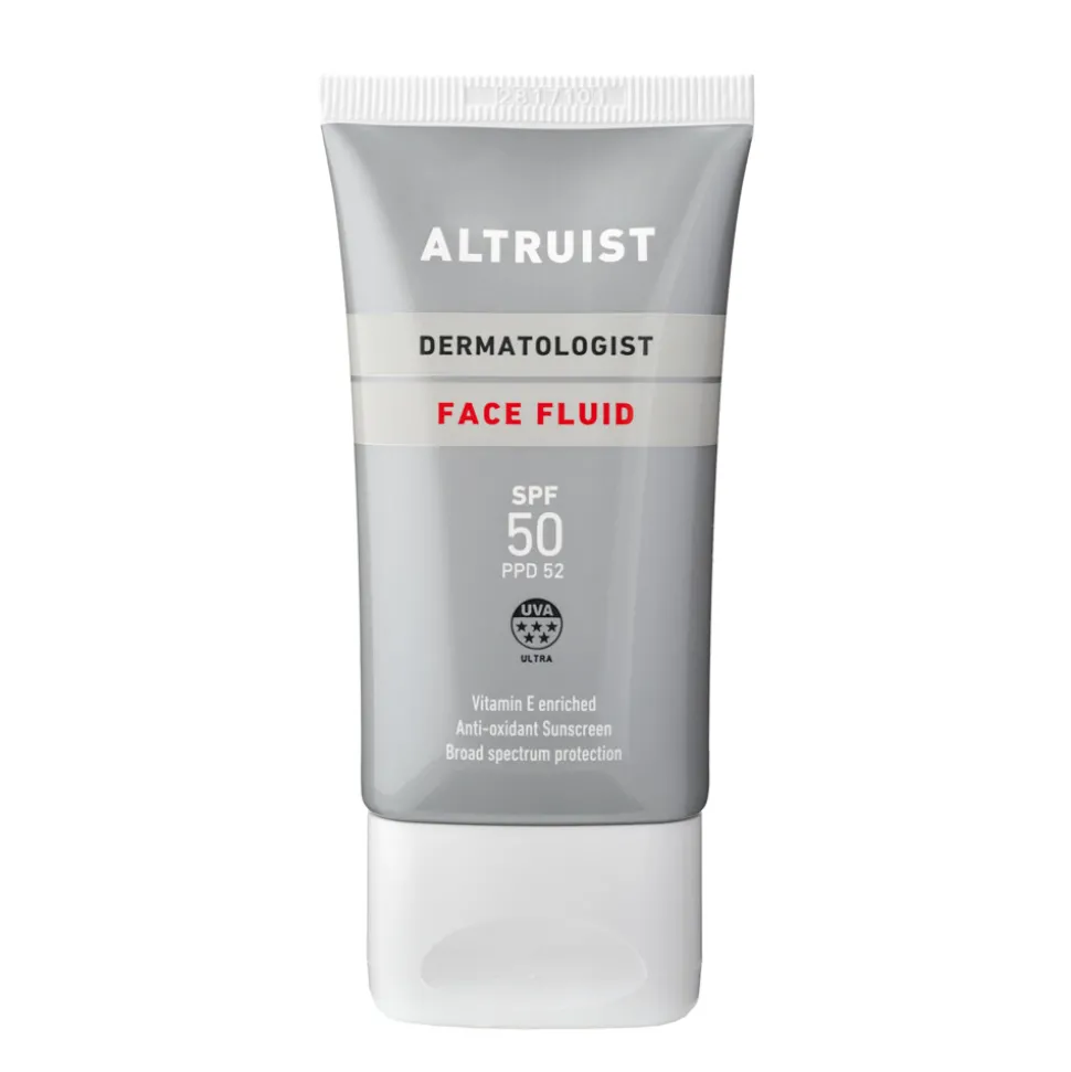 De nieuwe Altruist Dermatoloog SPF 50 Light Face Fluid is een intens hydraterende anti-oxidant gezichtszonnebrandcrème die een 5-sterren breed-spectrum dagelijkse bescherming biedt tegen UVA en UVB, die de EU-normen overtreffen. De formule is verrijkt met vitamine E om celbeschadiging door UV-geïnduceerde vrije radicalen en reactieve zuurstofsoorten te voorkomen en is ontworpen voor de gevoelige huid en om het risico op huidkanker en vroegtijdige huidveroudering te helpen verminderen.