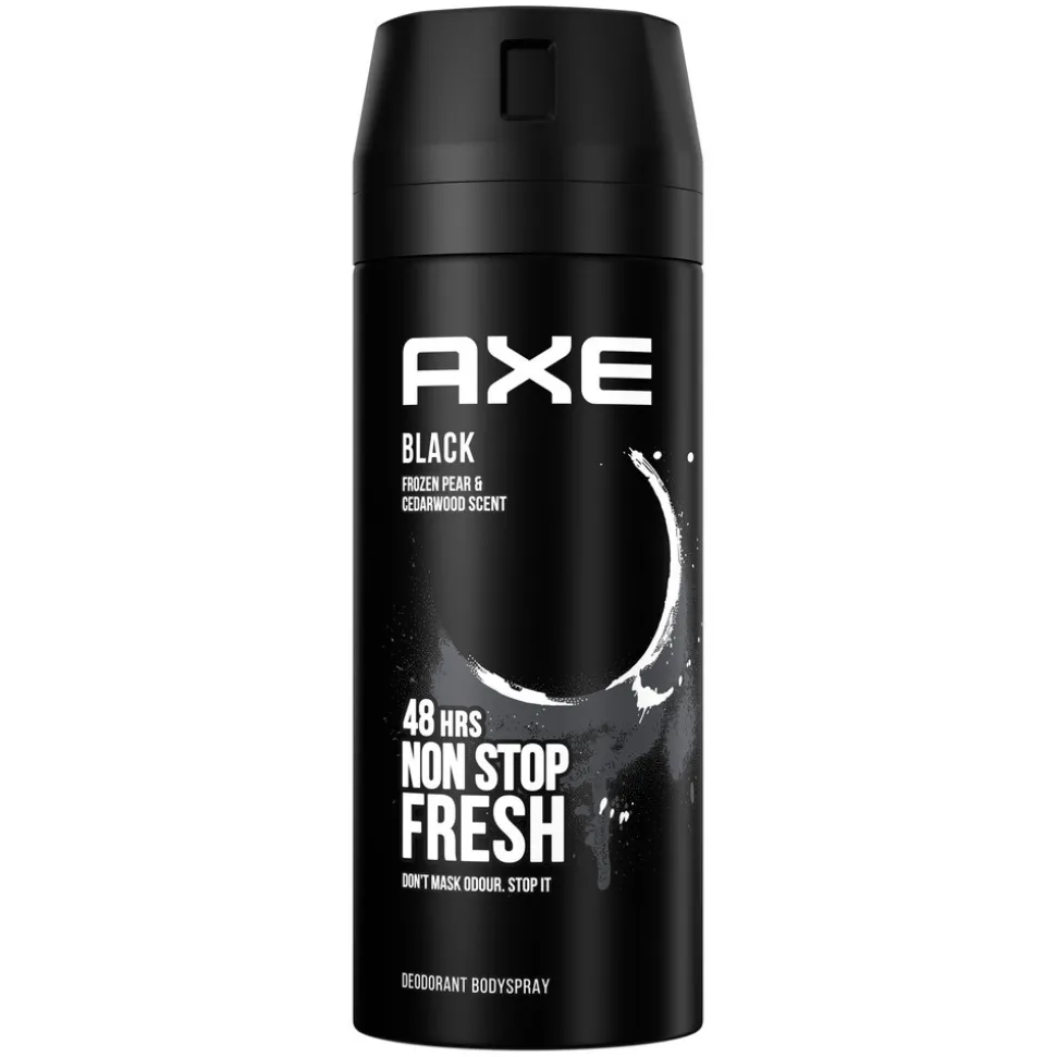 Ruik onweerstaanbaar fris met AXE Black Deodorant Bodyspray. Leef het dagelijkse frisse leven. Je weet nooit wat er kan gebeuren, dus heb je een bodyspray nodig om de hele dag heerlijk te blijven ruiken. AXE Black Deodorant Bodyspray met geurbestrijdende zink, verhoogd met 5% Zink-Zap technologie, stopt ongewenste lichaamsgeur en geeft je langdurige bescherming. Geniet 48 uur lang van de stimulerende geur van bevroren peer en cederhout. Wat er ook op je pad komt, met AXE ben je er klaar voor. De hele dag door.