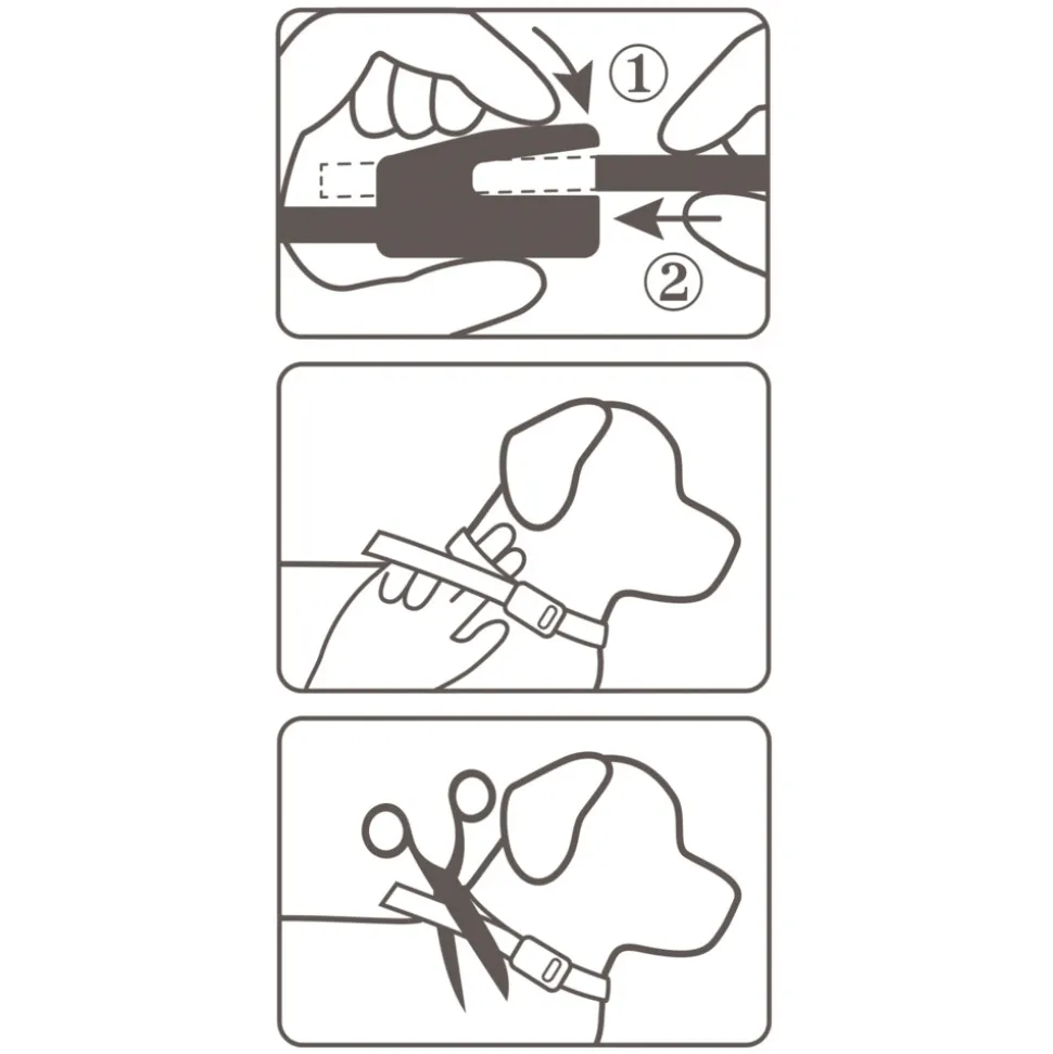 Haal de halsband pas vlak voor aanbrengen uit het beschermende sachet. Bevestig de halsband rond de nek van het dier niet te los en niet te strak: houdt twee platte vingers ruimte tussen de halsband en de nek van de hond. Knip het overtollige gedeelte van de band af (ca. 5cm voorbij de gesp). Controleer regelmatig of de band niet te strak of te los zit en pas indien nodig de lengte aan door de gesp in te knijpen en de band in de juiste positie te schuiven.