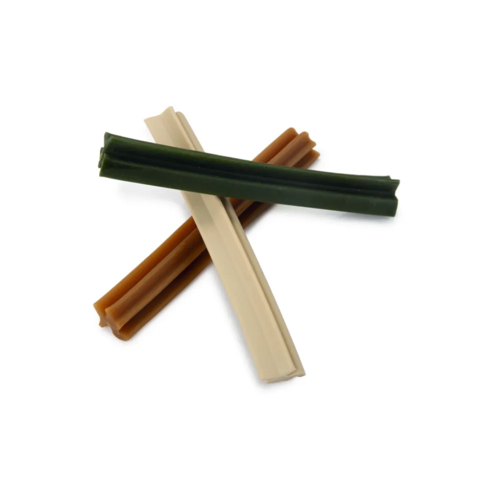Beeztees Hondensnack Veggie Staaf Mix 18 cm is een heerlijke snack voor jouw hond die qua samenstelling perfect is. De staaf heeft een tandheelkundig effect en is gemaakt van plantaardige ingrediënten. Hierdoor is deze snack laag in eiwitten, vetten en gluten. De mix bestaat uit drie varianten: mint, calcium en naturel.