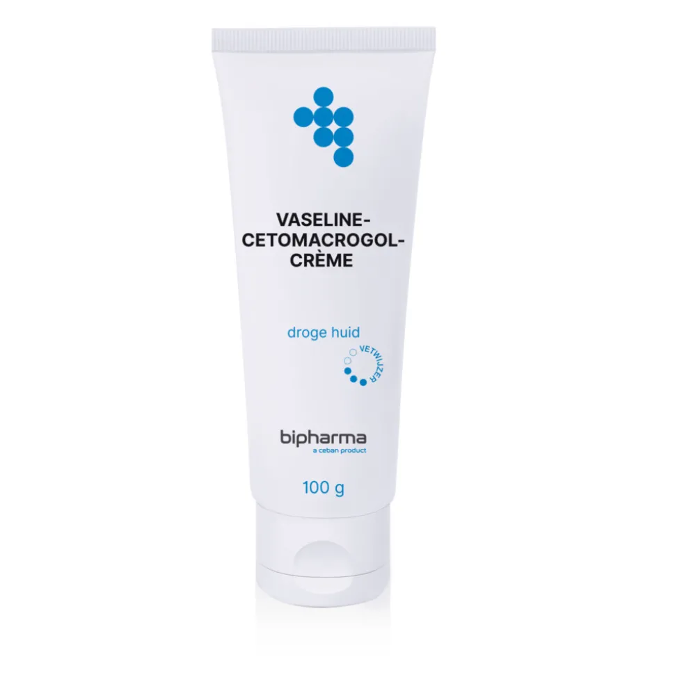 Bipharma Vaseline Cetomacrogolcrème is een rijke, goed smeerbare basiscrème die de droge huid intensief verzorgt. Dankzij de combinatie van vaseline en paraffine wordt de huid effectief beschermd tegen uitdroging en blijft het natuurlijke vocht beter behouden. Deze crème herstelt de vochtbalans en verzacht de huid merkbaar. Geschikt voor dagelijks gebruik op het hele lichaam – ook bij baby’s en kleine kinderen.