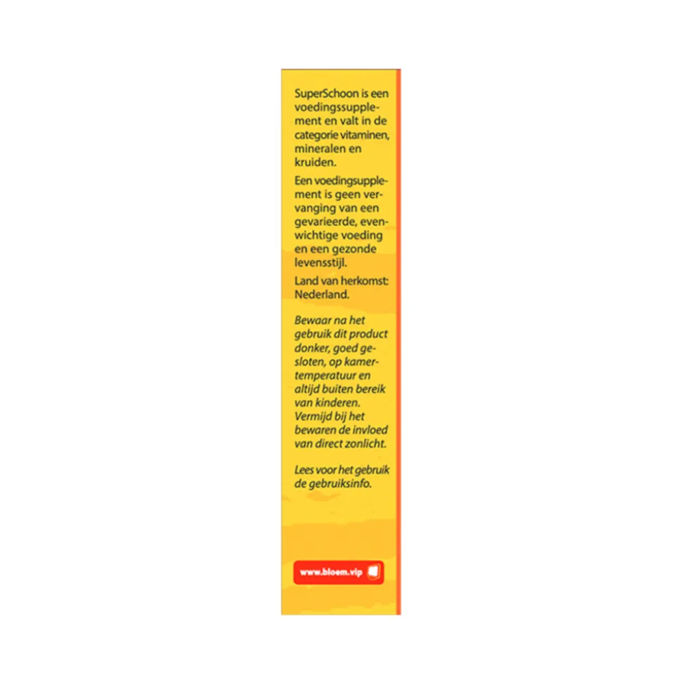 Deze Reiniging Formule (1) helpt om het lichaam te reinigen. Reinig je lichaam van binnen uit met Bloem SuperSchoon nr. 214. Dit kruidenpreparaat bevat cascara, kurkuma en Hydroxyanthraceenderivaten uit Vuilboom en Aloë. Daarnaast is er het probioticum Lactospore toegevoegd.