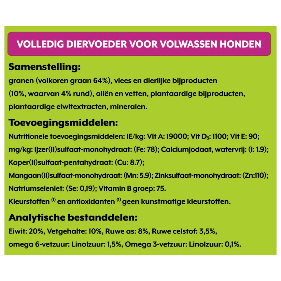 Granen (volkoren granen 64%), vlees en dierlijke bijproducten (10%, waarvan 4% rund), oliën en vetten, plantaardige bijproducten, plantaardige eiwitextracten, mineralen.