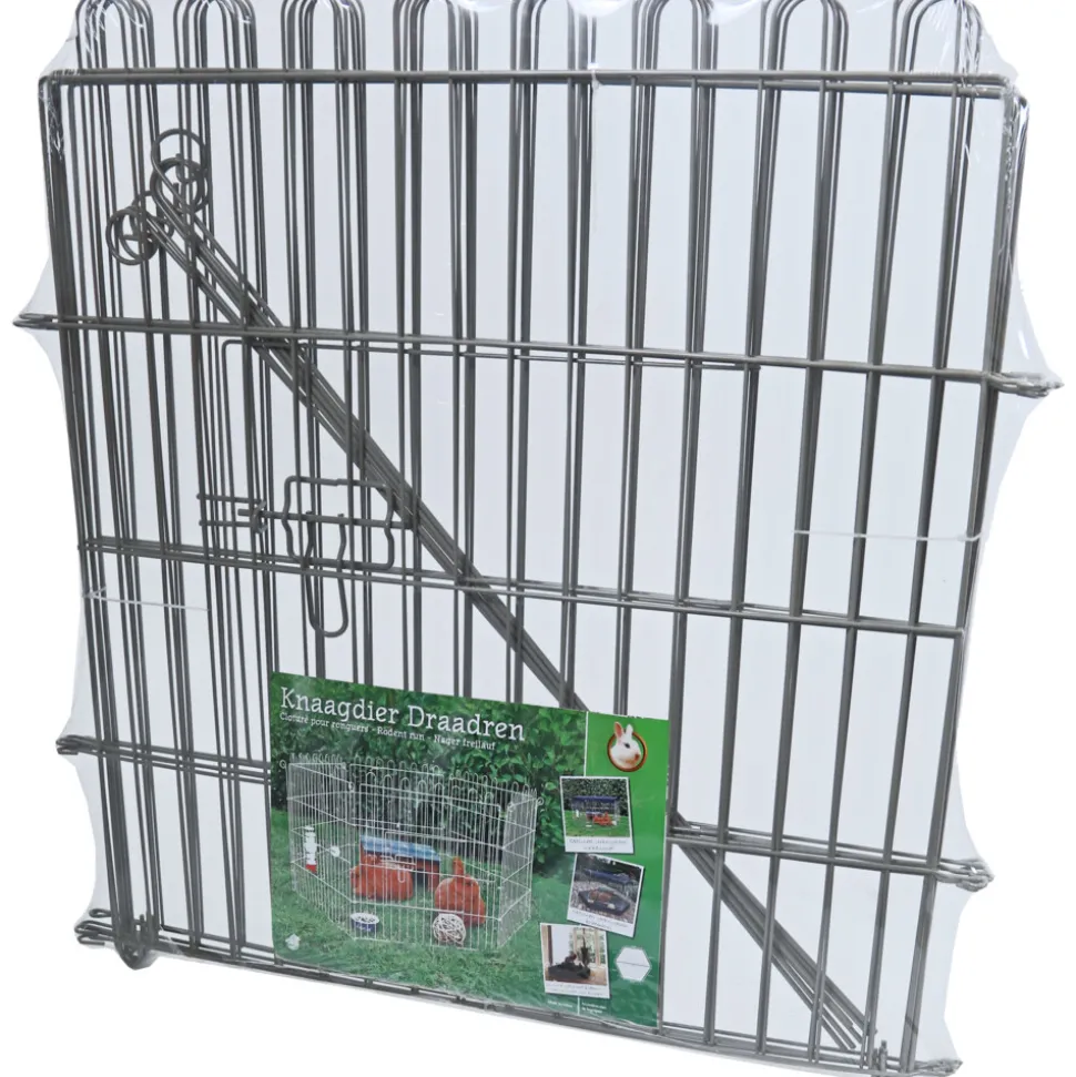 Voor lichaamsbeweging en speelplezier. De metalen konijnenloopren kan zowel op tegels als op gras geplaatst worden. De ren op de tegels plaatsen is goed voor de nagels zodat deze kunnen slijten aan de ruwe ondergrond. Op het gazon kan het dier lekker van het gras smullen. De ren kan bedekt worden met een speciaal afdeknet en of bodemhoes. Afdeknetten en bodemhoezen zijn los verkrijgbaar. Laat uw konijn regelmatig in de ren, zodat het dier voldoende bewegingsvrijheid heeft. Om het konijn op zijn gemak rond te laten lopen is het plaatsen van een huisje om te schuilen aan te bevelen (huisje is niet inbegrepen). De ren bestaat uit 6 panelen met een afmeting van: 67×60 cm per paneel (hxb), 1 paneel beschikt over een deur.