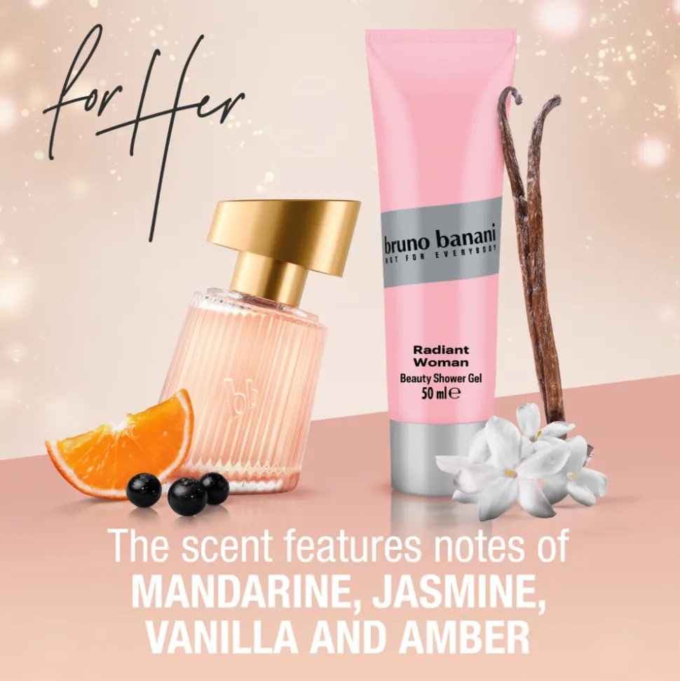 Straal zoals nooit tevoren met bruno banani Radiant Woman – een sprankelend en gedurfd Eau de Parfum dat de veelzijdigheid van vrouwen viert.Met een geur van een betoverende charme weerspiegelen de zorgvuldig geselecteerde ingrediënten de innerlijke schoonheid en energie van een stralende vrouw die zich altijd weet te vermaken.Een heerlijke geur die je de hele dag met je mee draagt: deze amberachtige bloemengeur opent met een sprankelende mix van topnoten, waaronder sappige mandarijn, peer en zwarte bes. In het hart geven heldere jasmijn, sprankelende tuberoos en oranjebloesem een levendig vrouwelijk karakter aan dit Eau de Parfum voor vrouwen. Basisnoten van sensuele vanille, amberachtige ondertonen en romig hout maken deze betoverende damesgeur helemaal af.In de rijke verpakking keert de kenmerkende schuine vorm van de Bruno Banani lichaamsparfums terug. De glazen flacon is licht gegroefd en is voorzien van een matgouden dop – een vleugje moderne glamour die het geheel een eigentijds karakter geeft. Bruno banani nodigt je persoonlijk uit om met Radiant Woman sprankelend voor de dag te komen. Not for everybody, but for you.