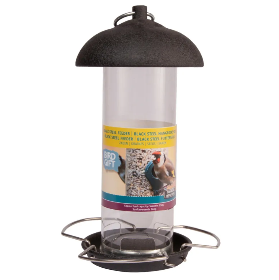 De Blacksteel zaadfeeder heeft een zwarte stalen deksel die je met een draai- kliksysteem kan bevestigen op de feeder. De feeder heeft ook een verwijderbare basis, waarop de vogels eventueel kunnen zitten. Deze feeder met een stevige staalconstructie is makkelijk te vullen en schoon te maken. De feeder is makkelijk te gebruiken en te vullen met zaden.