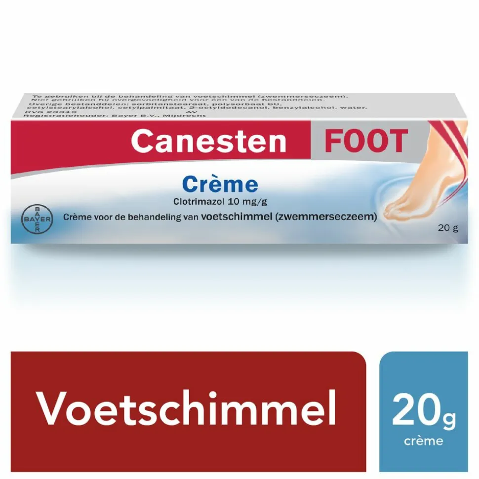 Voetschimmel, ook wel zwemmerseczeem genoemd, is niet gevaarlijk, maar kan wel erg vervelend zijn. Canesten Foot Crème pakt voetschimmel aan bij de bron en verlicht zo de jeuk en een branderig gevoel door de werkzame stof clotrimazol. De crème doodt de schimmels en herstelt de huid waardoor een nieuwe infectie minder kans heeft.