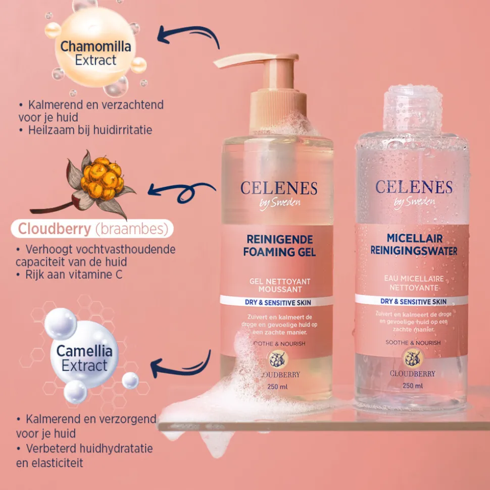 Ontdek de zachte foaming gel, verrijkt met plantenextracten van cloudberry, kamille en camelia. Deze unieke formule verwijdert voorzichtig vuil, stof en vervuiling van de huid, terwijl het de gevoelige huid voedt. Het bevat ook komkommerextract en mineralen die helpen om rimpels te voorkomen en de huid dagelijks te verzorgen. Dit product is alcoholvrij en geschikt voor dagelijks gebruik. – Geschikt voor de droge huid