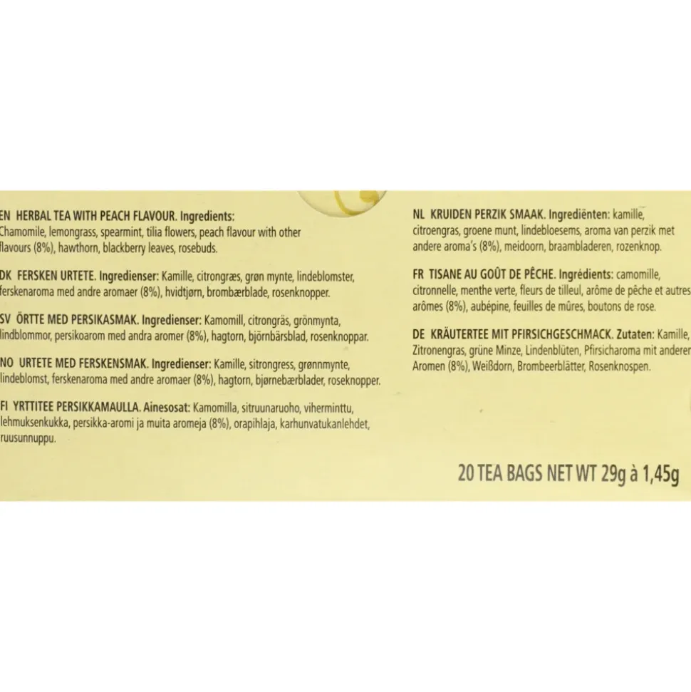 Ingrediënten Kamille (48%), citroengras, groene munt, lindebloesems, natuurlijk aroma van perzik met andere natuurlijke aroma’s (8%), meidoorn, braamblad, oranjebloesems en rozenknop.
