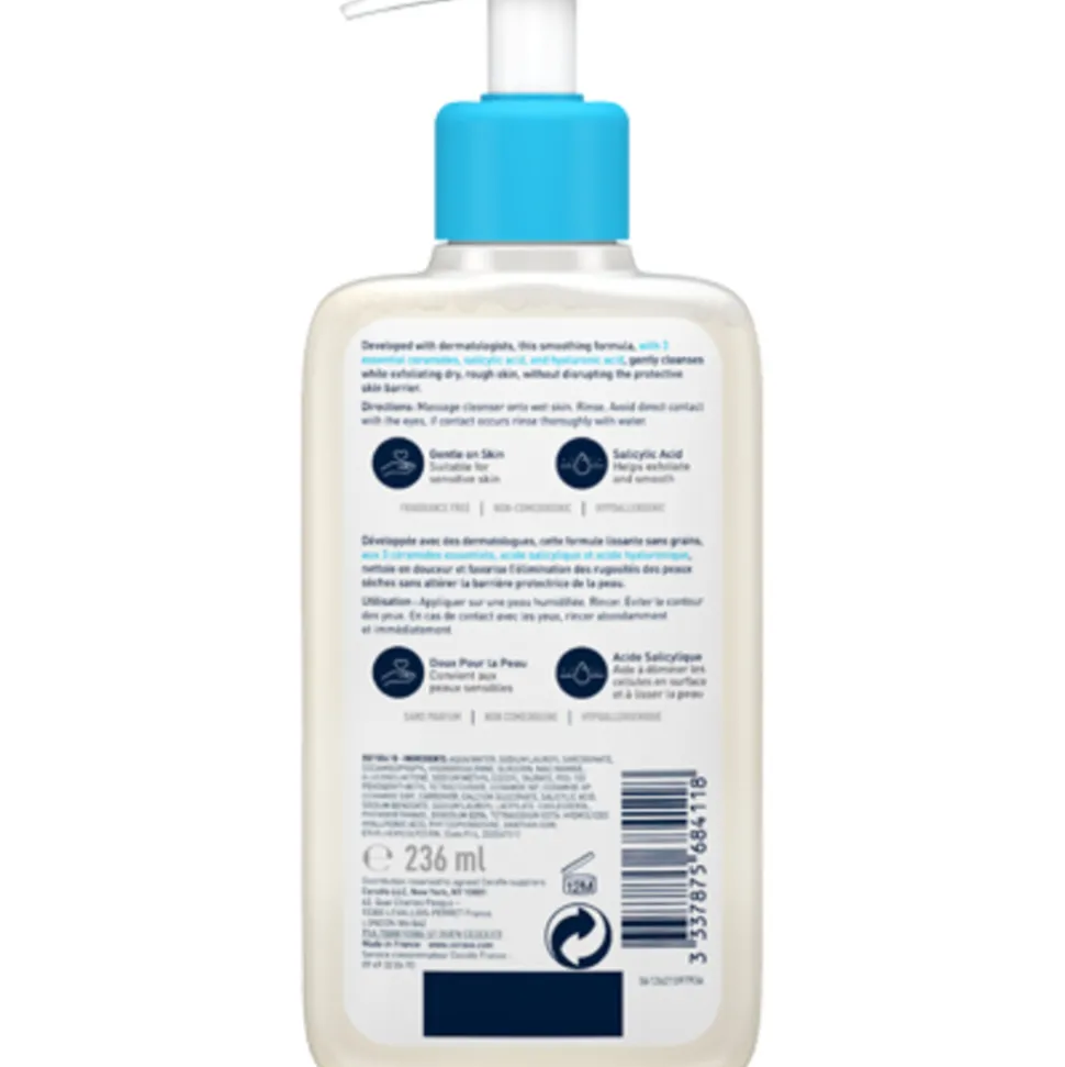 CeraVe Anti-Ruwe Huid Reiniger ontwikkeld met dermatologen, is geformuleerd om de droge, ruwe en korrelige huid te exfoliëren, te verzachten en glad te maken, zonder de huidbarrière aan te tasten.