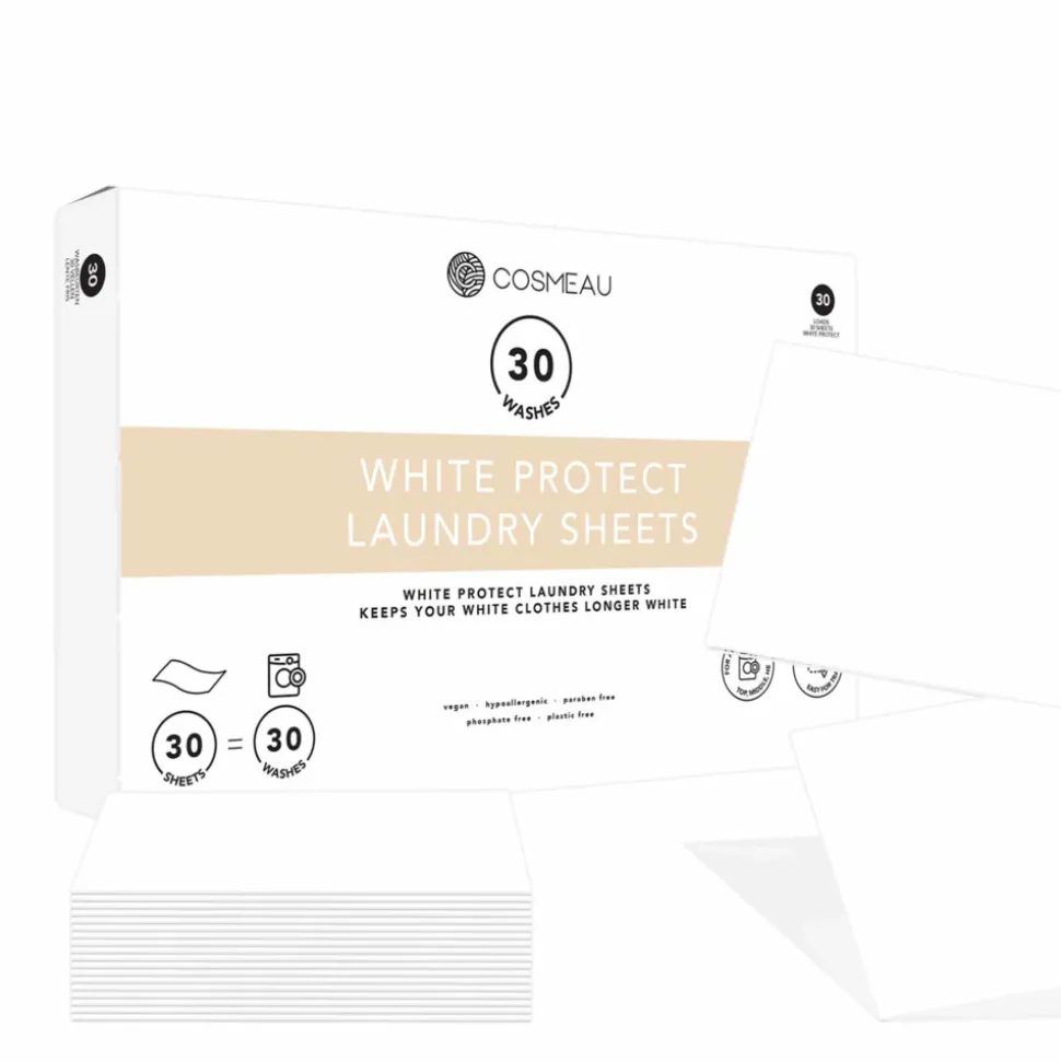 Wil je af van de doffe uitstraling van je witte kleding? Probeer Cosmeau’s White Protect sheets met actieve elementen om je witte was niet alleen langer helder te houden, maar ook witter te maken! Gebruik je wasstrips? Hoewel wasstrips geschikt zijn voor alle kleuren, kunnen ze je witte kleding doffer maken. Met White Protect kunnen je kleren enkele tinten lichter worden. Belangrijk: Dit is geen wasmiddel, maar een velletje dat je toevoegt aan je witte was. Alleen te gebruiken bij witte kleding!
