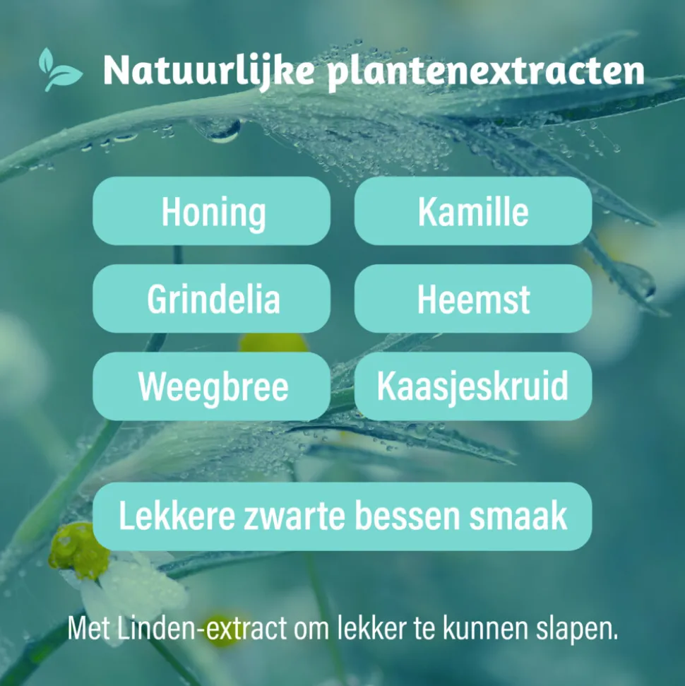 Fructose, gezuiverd water, honing, zwarte bessensap, kamille zacht extract, grindelia droog extract, heemst droog extract, weegbree droog extract, kaasjeskruid droog extract, linden droog extract, aroma, citroenzuur, xanthaangom, natriumbenzoaat en kaliumsorbaat.