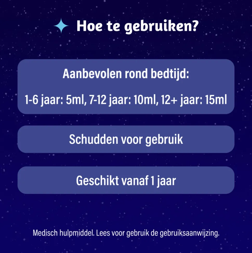Gebruik het bijgeleverde maatdopje. Sluit de dop goed na gebruik. Wanneer nodig kan de inname éénmaal per nacht worden herhaald. Lees voor gebruik de gebruiksaanwijzing. Vanwege de hoeveelheid plantenextracten kan het product kleine onopgeloste deeltjes bevatten; dit heeft geen effect op de kwaliteit. Dampo Kids Alle Hoest Nacht is een medisch hulpmiddel.