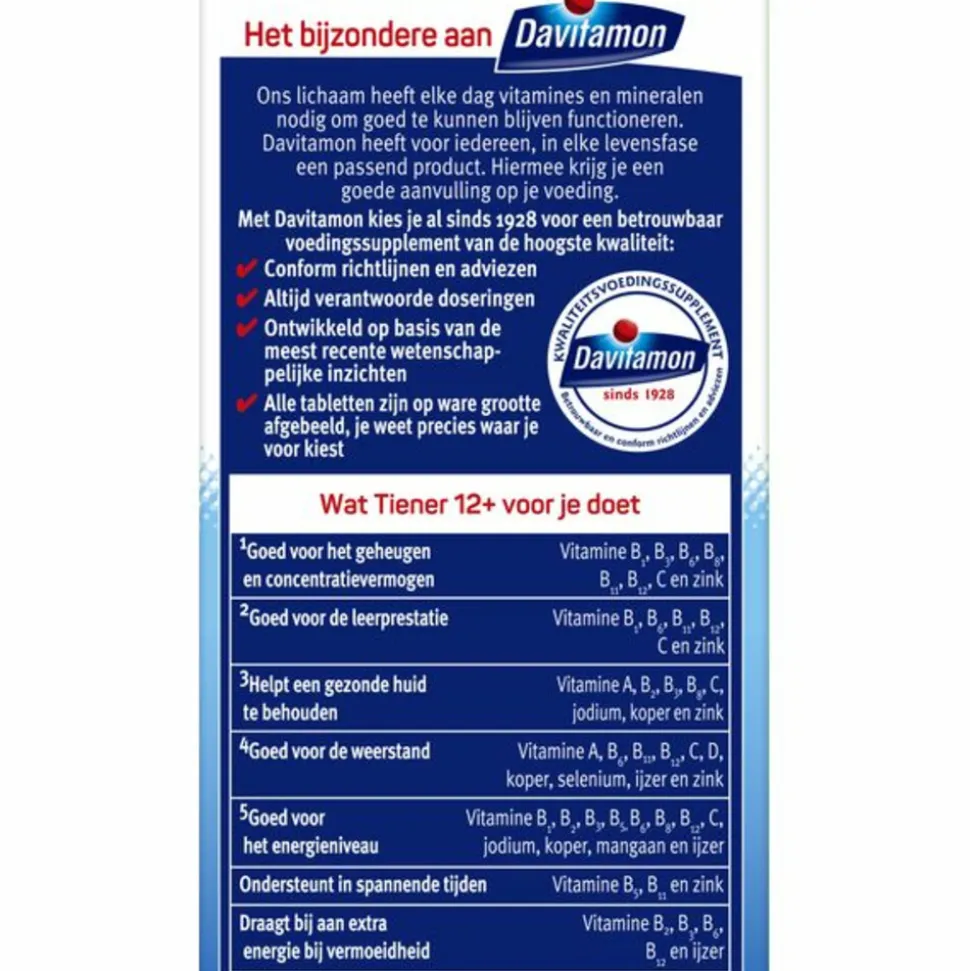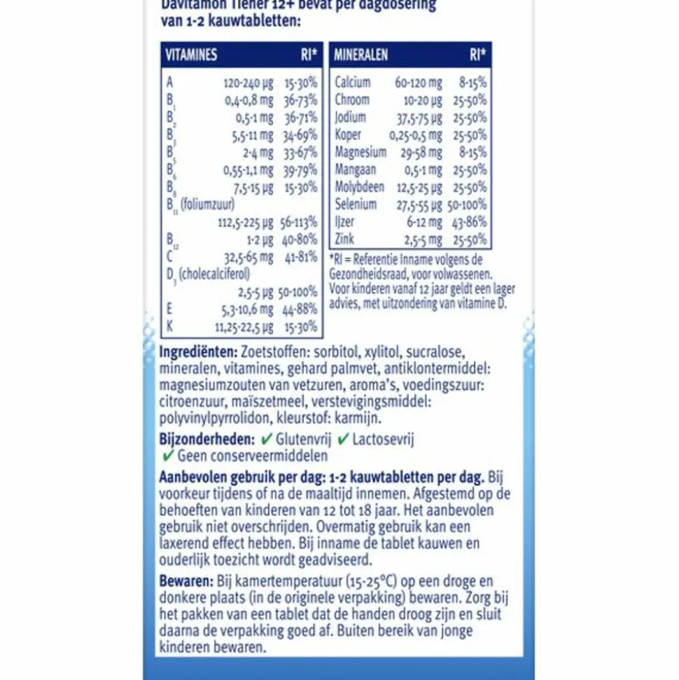 Davitamon Tiener 12+ kauwtabletten met aardbeiensmaak zijn speciaal ontwikkeld voor jongeren tussen de 12 en 18 jaar. In deze leeftijdsfase is het belangrijk om voldoende vitaminen en mineralen binnen te krijgen voor een gezonde ontwikkeling. Deze kauwtabletten zijn een handige aanvulling op de dagelijkse voeding.