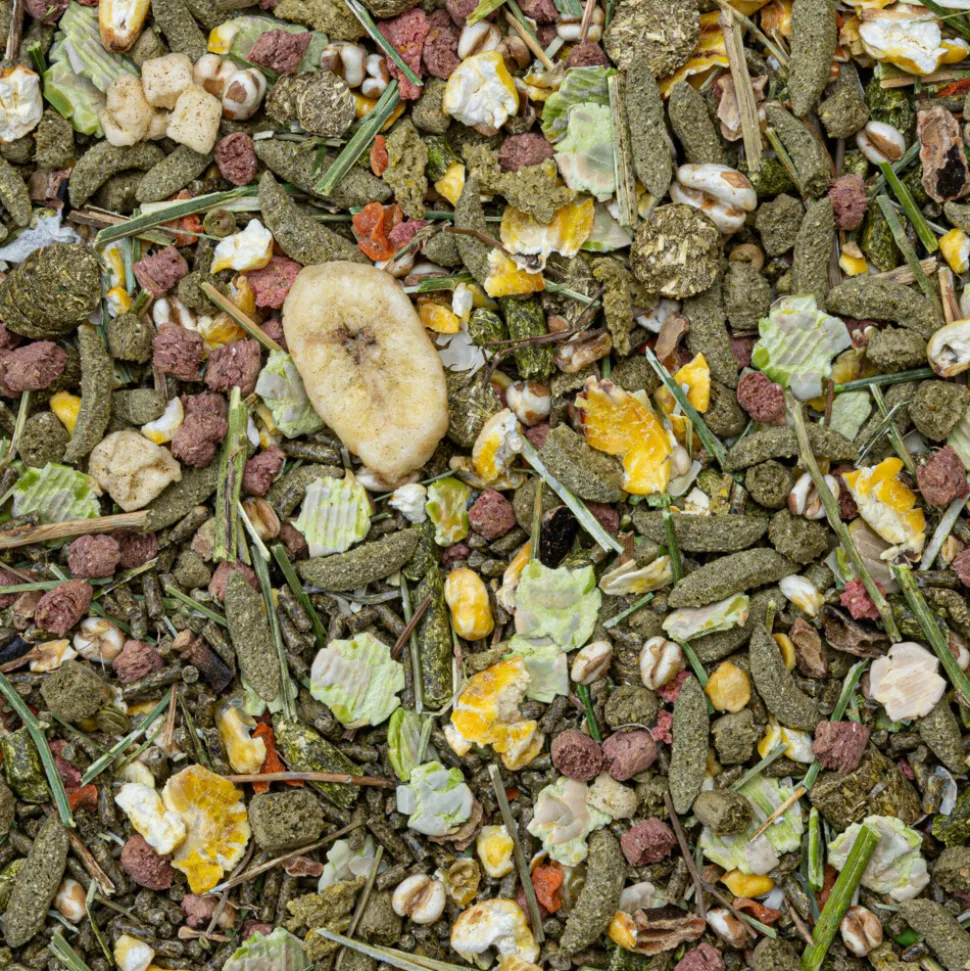 Verstrek dagelijks een verse portie voer, hooi van hoge kwaliteit en zuiver drinkwater. Richtlijnen hoeveelheid voer: zie voedingstabel verpakking.