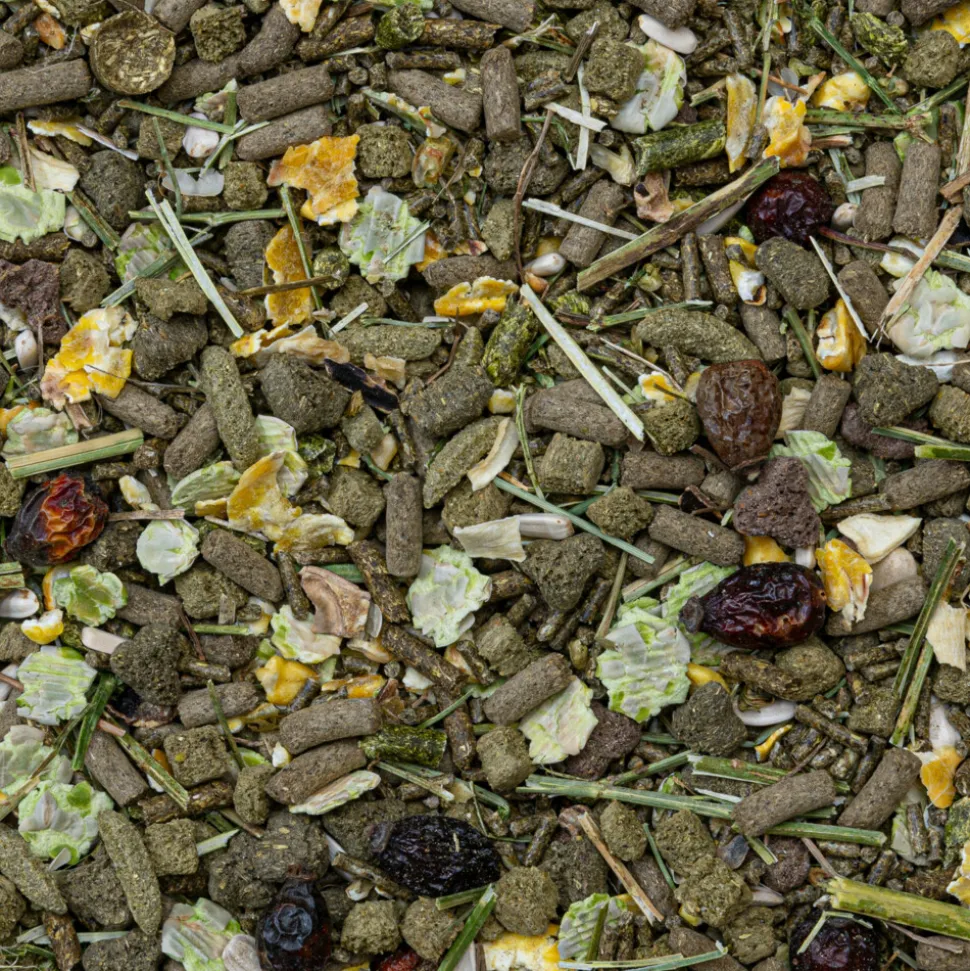 Verstrek dagelijks een verse portie voer, hooi van hoge kwaliteit en zuiver drinkwater. Richtlijnen hoeveelheid voer: zie voedingstabel verpakking.