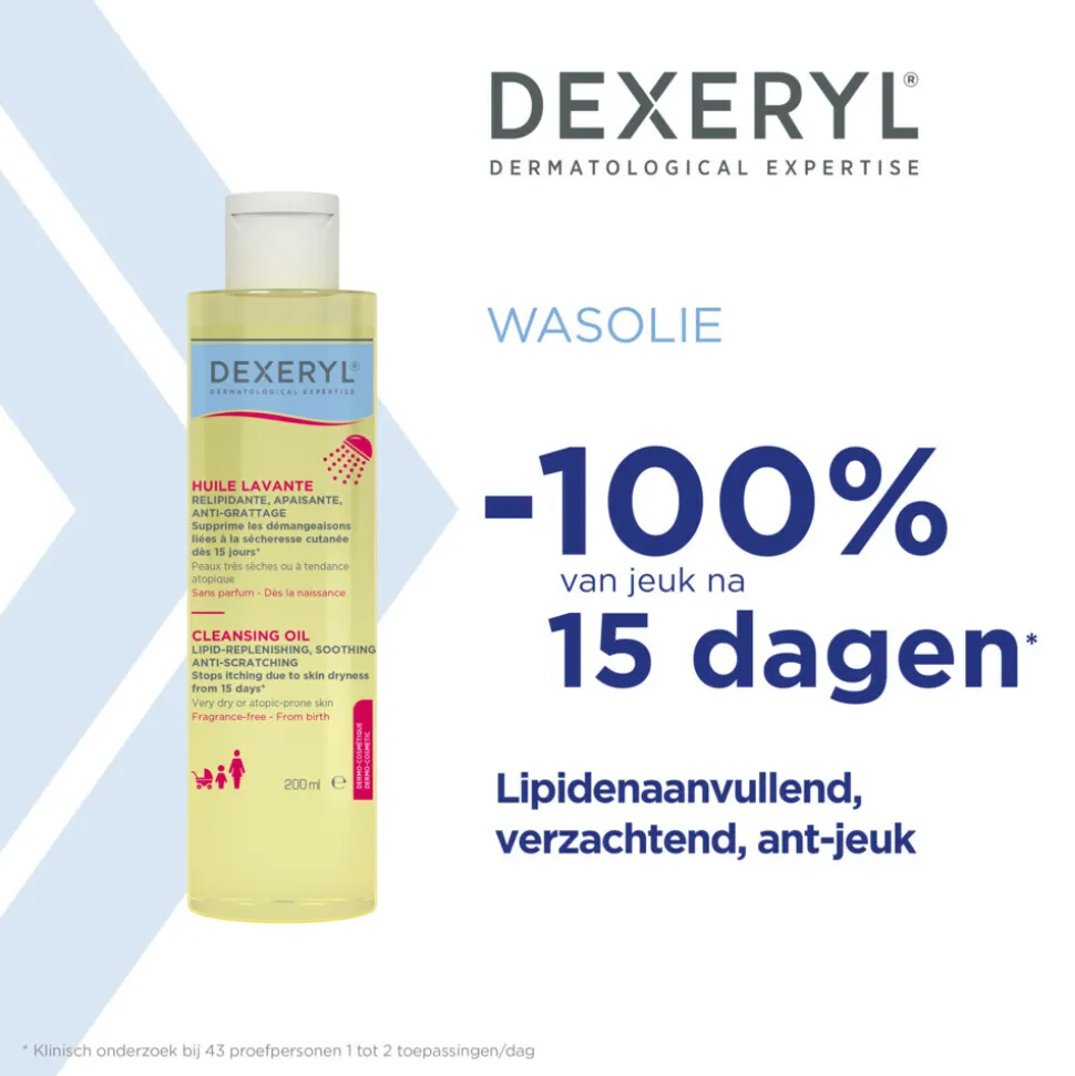 Een droge huid of huid gevoelig voor eczeem kan al snel huidirritaties vertonen bij contact met water en zeep. Dexeryl reinigingsolie is speciaal ontwikkeld voor de (zeer) droge en de huid die gevoelig is voor eczeem. De formule reinigt de huid op milde wijze, verzacht, relipideert en beschermt de huidbarrière. Het vermindert 100% de jeuk als gevolg van droge huid na 15 dagen gebruik, hydrateert en relipideert de huid van het hele gezin. De formule zonder zeep en parfum is geschikt voor gebruik bij baby’s vanaf de geboorte. De vloeibare textuur is gemakkelijk aan te brengen en omhult de huid met een aangenaam luchtig en zacht schuim, dat al even gemakkelijk weer af te spoelen is.