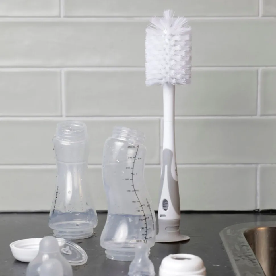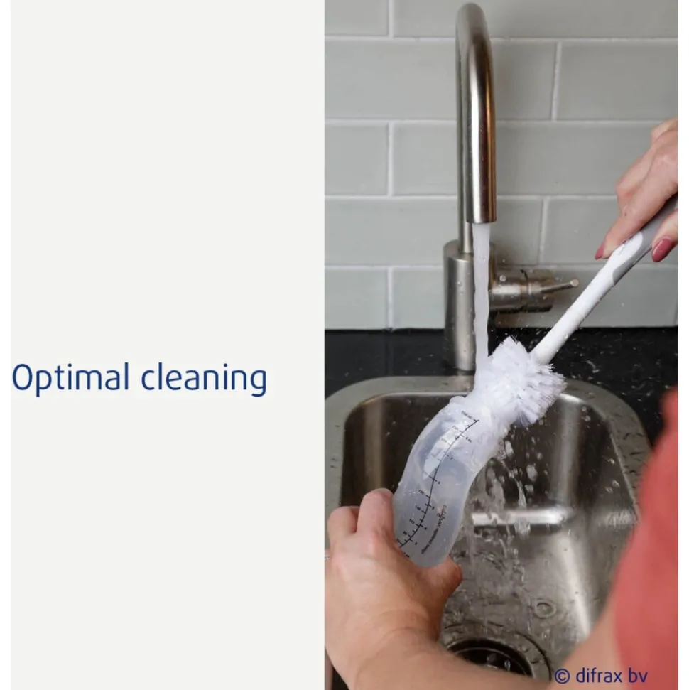 De Difrax Speen en flessenborstel is ideaal voor het reinigen van de babyfles, de speen en de bodem. De geïntegreerde spenen borstel gebruik je voor het reinigen van de flessenspeen en lastige hoekjes. De babyfles is zo volledig vrij van melkvoeding of andere flesvoedingresten. Maak de babyfles altijd eerst goed schoon met een flessenborstel voordat je de fles steriliseert. Zo blijven er geen melk- en flesvoedingresten achter, die schadelijk kunnen zijn voor de gezondheid van je baby. Reinig de flessenborstel onder de hete kraan of in de vaatwasser.