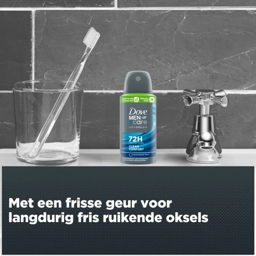 De Dove Men+Care Advanced Clean Comfort Anti-Transpirant Deodorant Spray beschermt 72 uur lang tegen zweet en geurtjes, heeft een langdurig frisse geur en verzorgt je oksels. Het bieden van bescherming komt op de eerste plaats bij deze anti-transpirant spray. Gemaakt met de revolutionaire Triple Action Technologie, is deze anti-transpirant ontworpen om je tot 72 uur lang tegen zweet en geur te beschermen. Met een frisse, mannelijke geur om je langdurig fris en zelfverzekerd te voelen. Deze Dove Men+Care anti-transpirant is verrijkt met onze unieke ¼ hydraterende crème, die je okselhuid verzorgt. Irritaties door zweet en scheren behoren tot het verleden. Je krijgt een gehydrateerde en beschermde huid en gladde, comfortabel aanvoelende oksels. Altijd onderweg? Bewaar deze mini anti-transpirant in je tas, bureaulade of handbagage, zodat je altijd gemakkelijk toegang hebt tot de beste bescherming. Deze verpakking is namelijk perfect om mee te nemen op reis. Dankzij de Compressed-technologie gaat deze kleine spuitbus van 75 ml net zo lang mee als de Dove Men+Care spuitbus van 150 ml, maar dan met minder verpakking.