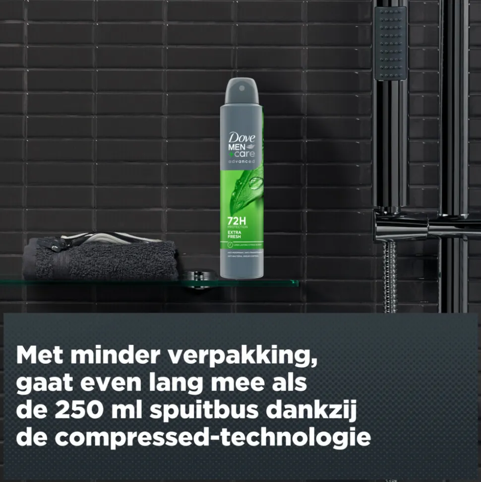 De Dove Men+Care Advanced Extra Fresh Anti-Transpirant Deodorant Spray beschermt 72 uur lang tegen zweet en geurtjes, het heeft een langdurig frisse geur en verzorgt je oksels. Het bieden van bescherming komt op de eerste plaats bij deze anti-transpirant spray. Gemaakt met de revolutionaire Triple Action Technologie, is deze anti-transpirant ontworpen om je tot 72 uur lang tegen zweet en geur te beschermen. Met een energieke, frisse geur om je langdurig fris en zelfverzekerd te voelen. Het combineren van bescherming met verzorging is belangrijk om ervoor te zorgen dat je oksels de beste bescherming krijgen. Daarom is de Dove Men+Care Advanced Extra Fresh Anti-Transpirant Deodorant Spray verrijkt met 1/4 hydraterende crème, om je huid te hydrateren en te voeden voor gladde en gezond aanvoelende oksels. Dankzij de Compressed-technologie gaat deze spuitbus van 200 ml net zo lang mee als de Dove Men+Care spuitbus van 250 ml, maar dan met minder verpakking.