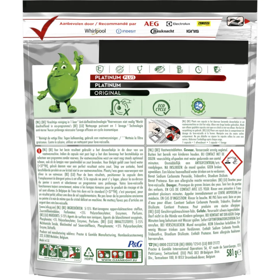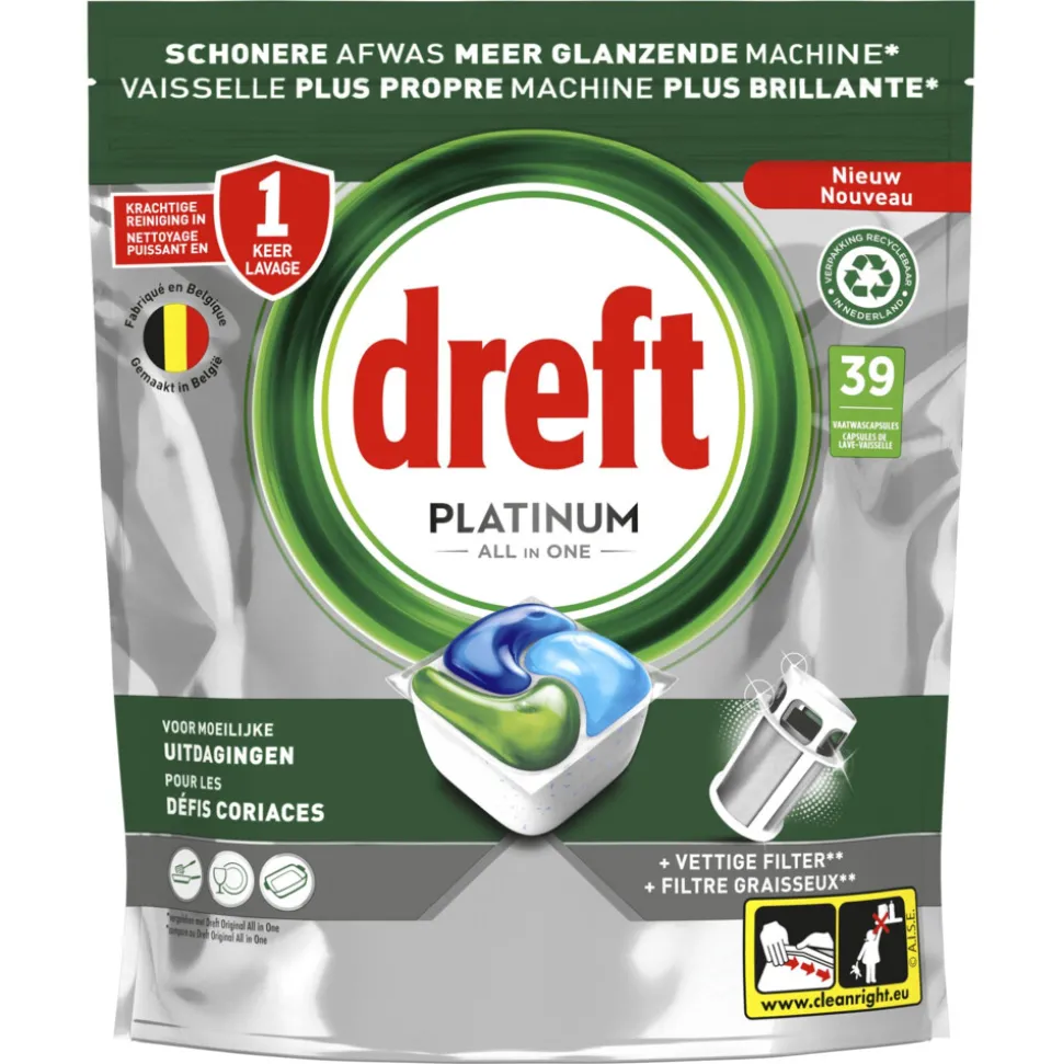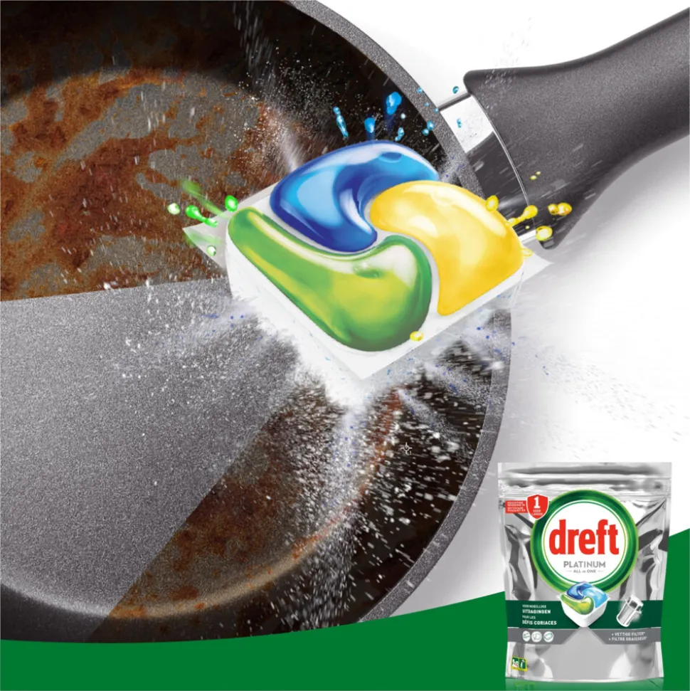 De Dreft Platinum All in One vaatwastabletten leveren een grondige reinigingsactie en reinigen zelfs de hardnekkigste vlekken om je vaat te laten schitteren. Dankzij de reinigingskracht van Dreft Platinum kun je in alle vertrouwen koken wat je wilt, want het haalt zelfs het vet uit je filter, voor een schone vaat en een frisse vaatwasser. Dreft combineert vloeistof en poeder in één krachtige capsule. Het ultra-oplosbare zakje lost snel op, zodat het snel begint te reinigen om de klus klaar te krijgen. En ze zijn gemakkelijk te gebruiken. Plaats ze gewoon in het doseerbakje van je vaatwasser, met verpakking.