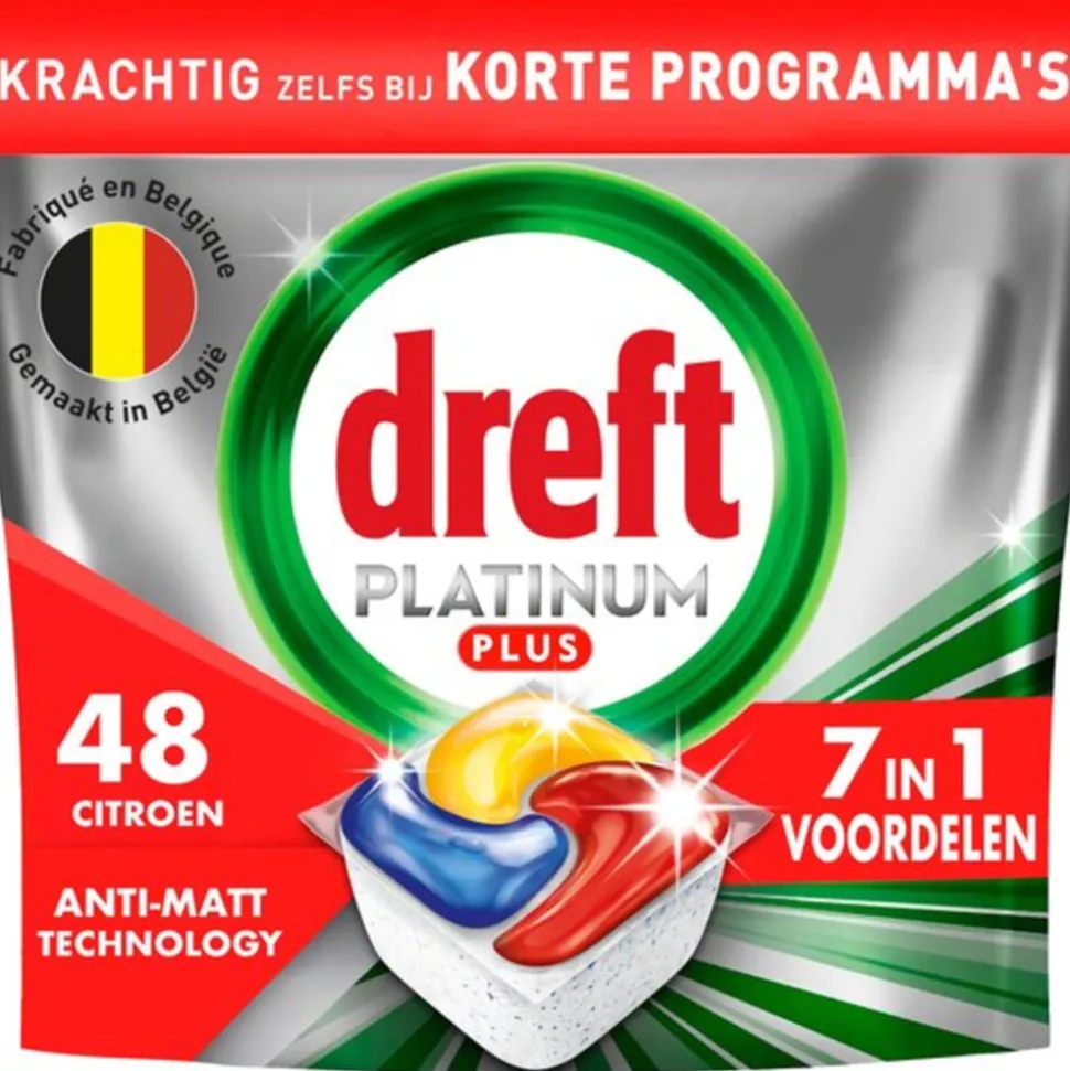 Dreft Platinum Plus All in One vaatwastabletten zorgen voor een reiniging als nieuw, het geeft je Dreft’s beste collectie voor het reinigen van hardnekkig voedsel en het helpt zelfs de dofheid weg te nemen die in de loop van de tijd is opgebouwd, om de oorspronkelijke glans van je vaatwerk te herstellen. Dreft Platinum Plus geeft je een uitmuntende reiniging en verwijdert hardnekkige voedselvlekken, zelfs in de testconditie van een korte cyclus. Dus, als je weinig tijd hebt, is er niets aan de hand. Schakel over op kort. Dreft combineert vloeistof en poeder in één krachtige capsule. Het ultra-oplosbare zakje lost snel op en werkt goed in korte cycli omdat het snel begint te reinigen om de klus klaar te krijgen. En ze zijn gemakkelijk te gebruiken. Plaats ze gewoon in het doseerbakje van je vaatwasser, met verpakking.