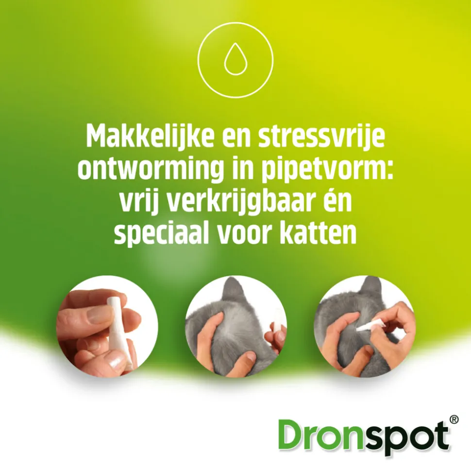 De spot on ontworm formule van Dronspot zorgt ervoor dat je kitten makkelijk preventief ontwormt is. Het fijne van de spot on formule is dat je een klein flacon in de nek van huisdier aanbrengt waardoor de vloeistof op de huid terecht komt en zo opgenomen wordt door het lichaam, geen gedoe met pilletjes meer!