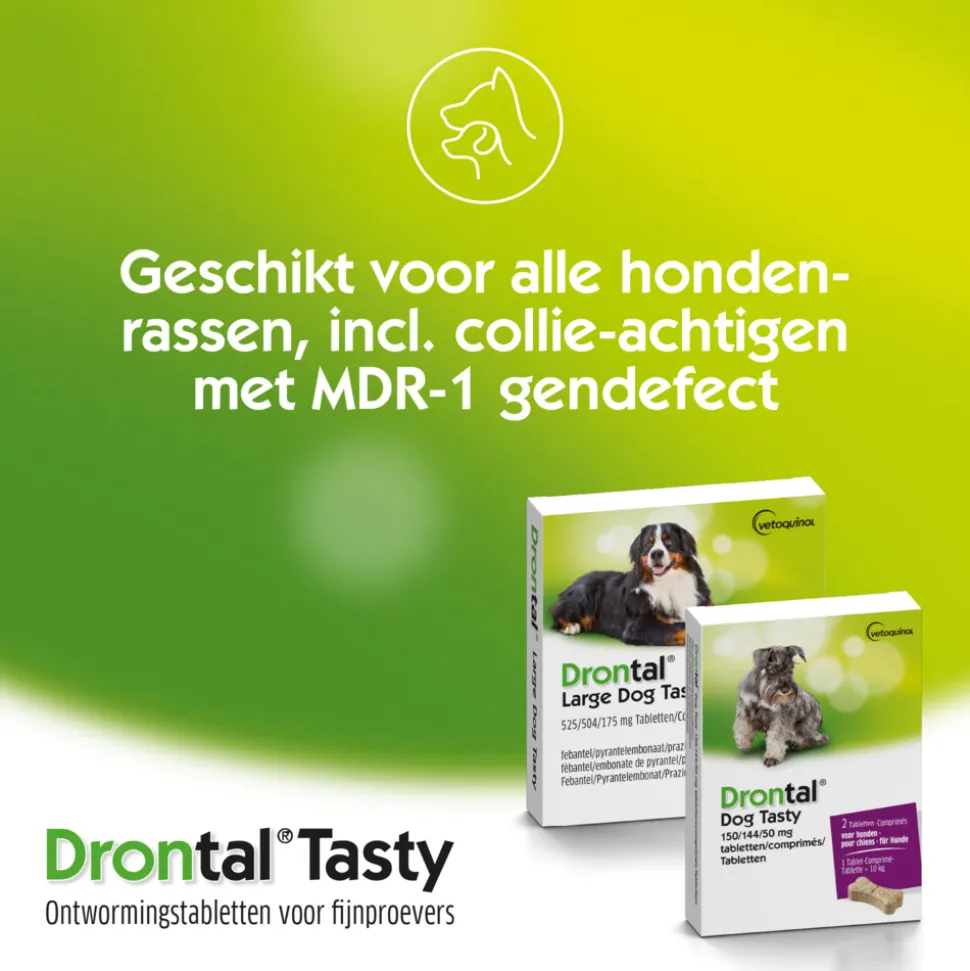 Drontal Dog Tasty is een breedspectrum ontwormingsmiddel dat spoelwormen, lintwormen (o.a. de vlooienlintworm en de vossenlintworm), haakwormen en zweepwormen doodt na eenmalige toediening.
