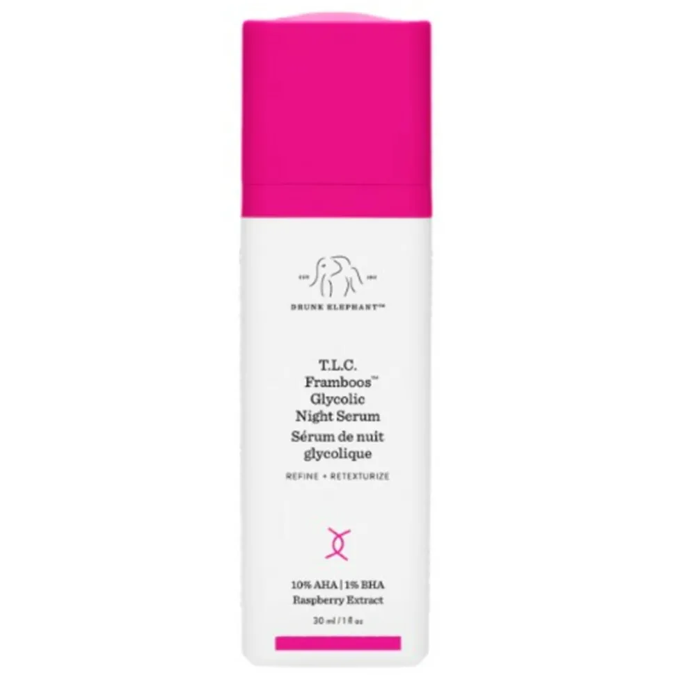 Het Drunk Elephant T.L.C. Framboos Glycolic Night Serum is een krachtig nachtserum dat de huid exfolieert en vernieuwt terwijl je slaapt. Het serum bevat 12% glycolzuur en frambozenextracten die de huidtextuur verbeteren, poriën verfijnen en fijne lijntjes verminderen. Daarnaast bevat het ook salicylzuur en melkzuur voor een egale en stralende teint. Dit serum is geschikt voor alle huidtypes en zorgt voor een zachte en gladde huid bij regelmatig gebruik.