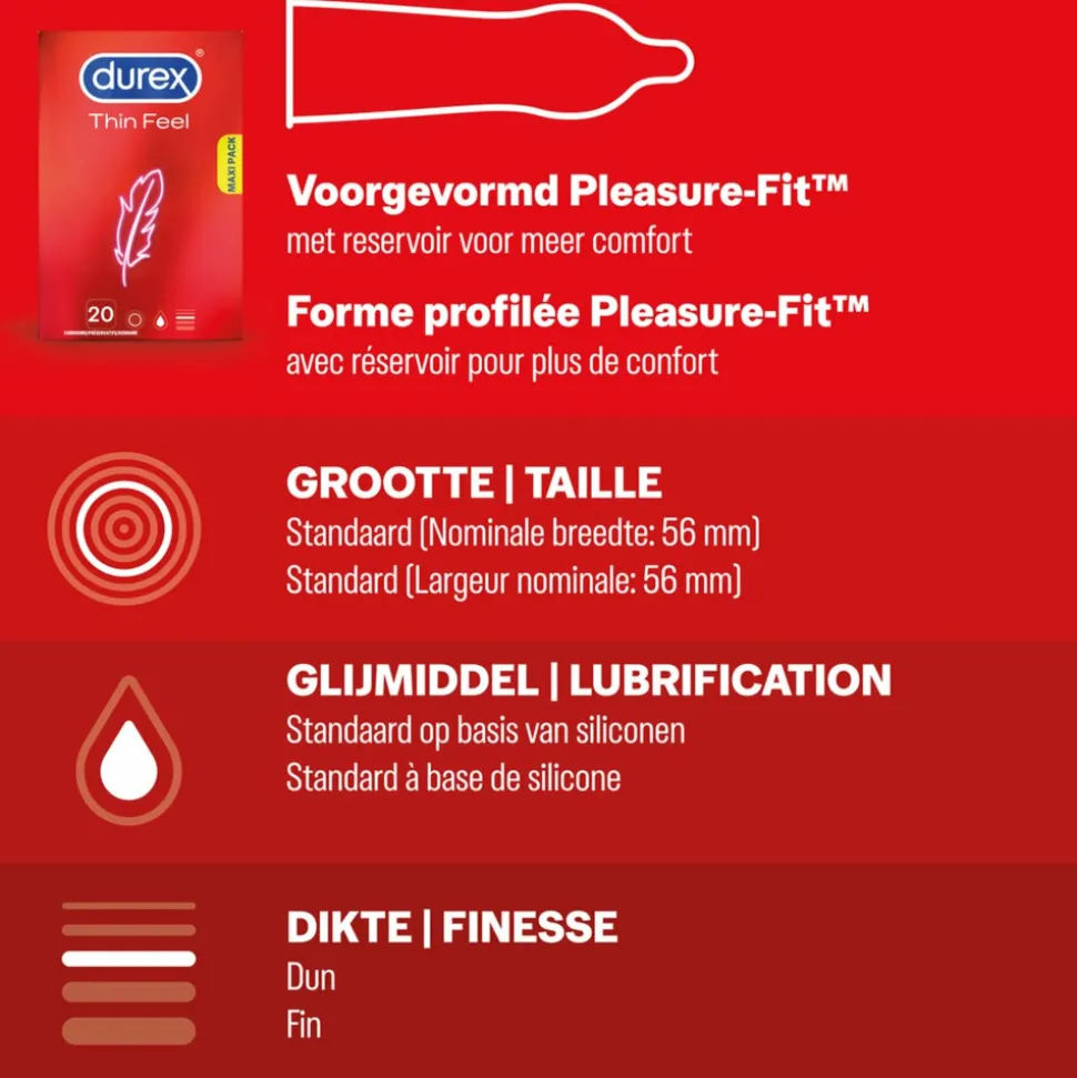 De Durex Thin Feel condooms zijn dunner dan de classic condooms van Durex voor meer sensatie. Houd je niet zo van het gevoel van dikkere condooms? Probeer dan de Thin Feel-condooms voor een heel andere ervaring. Je voelt meer tijdens het vrijen, en toch zijn deze condooms even betrouwbaar als de rest van het Durex-gamma.