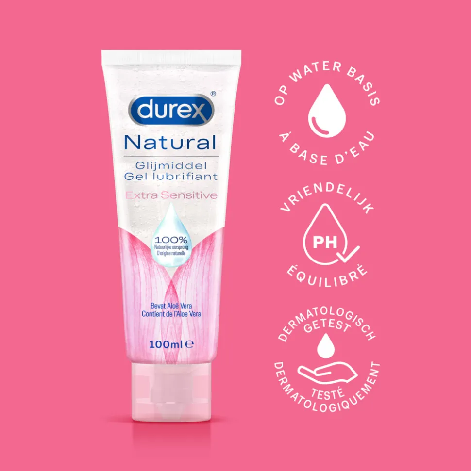 - Dit glijmiddel is geschikt voor condooms en seksspeeltjes van Durex