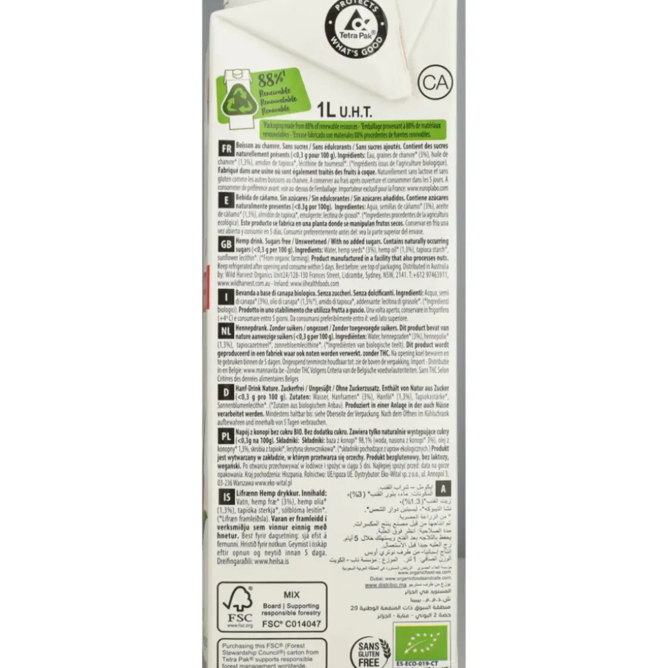 Water, hennepzaden * (3%), hennepolie * (1,3%), tapiocazetmeel *, emulgator: zonnebloemlecithine *.