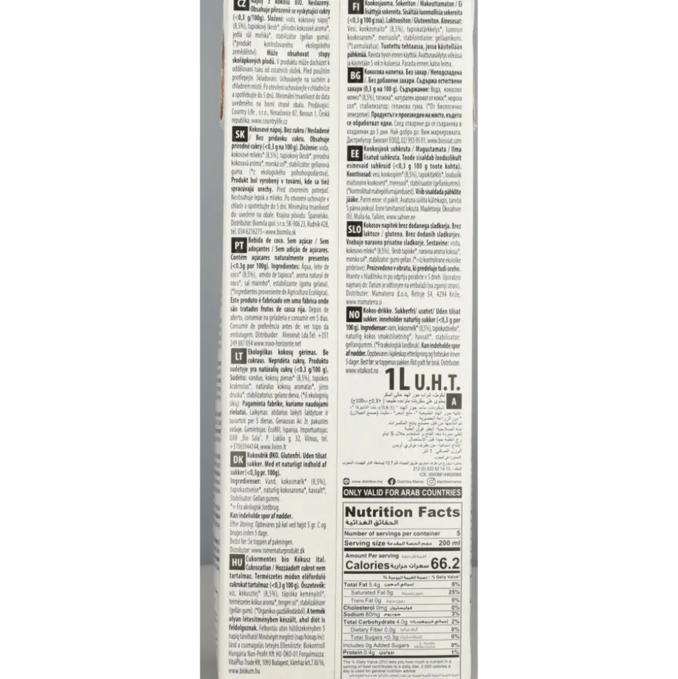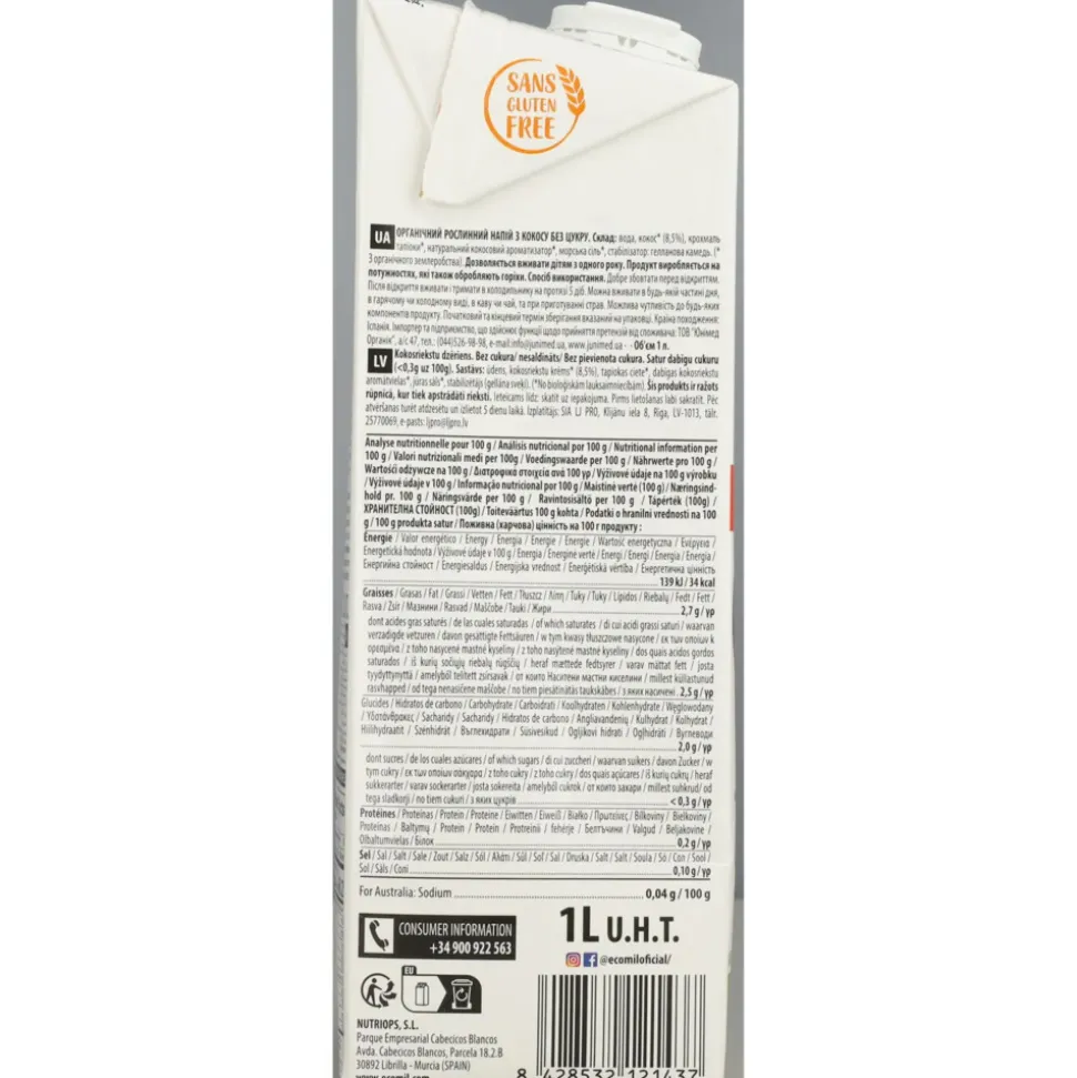 Kokosnoot is een verrassende vorm van verfrissing, zowel als plantaardige drank als voor nieuwe culinaire ideeën. Deze kokosmelk mag de claim ‘suikervrij’ dragen aangezien ze minder dan 0.5 gr suiker per 100 gr of 100 ml bevat; en ‘zonder zoetstoffen’ omdat ze geen ingrediënten bevat die gebruikt worden voor hun zoetmakende eigenschappen. Ze bevat echter wel van nature aanwezige suikers met een gehalte van 0.1 g per 100 gr of 100 ml.