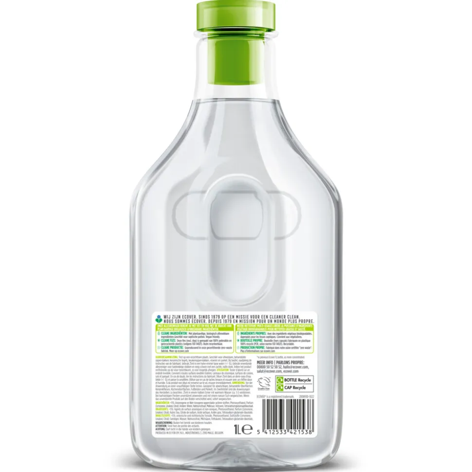 Ecover Citroengras & Gember Allesreiniger is een krachtige en uiterst effectieve allesreiniger waarvan de ingrediënten van plantaardige oorsprong zijn. Het maakt alle oppervlakken hygiënisch schoon en geeft een frisse geur terwijl het geen ongewenste chemicaliën in huis achterlaat. Bovendien is Ecover Allesreiniger gebaseerd op plantaardige en minerale grondstoffen, volledig en snel afbreekbaar voor minimale belasting van het waterleven en niet getest op dieren.