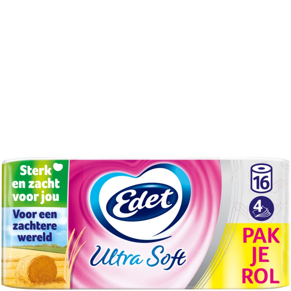 Edet Ultra Soft 4-laags toiletpapier biedt jou ultiem comfort en een duurzamere keuze. Dankzij het gebruik van een deel stro worden grondstoffen bespaard, zonder dat je hoeft in te leveren op zachtheid of sterkte. Dit toiletpapier voelt extra zacht aan en is natuurlijk sterk. Bovendien is de verpakking recyclebaar en deels gemaakt van gerecycled plastic. Zo kies je met gemak voor kwaliteit én het milieu.