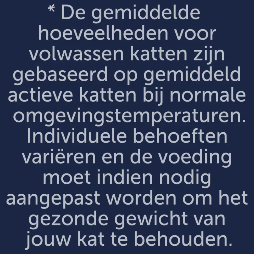*De gemiddelde hoeveelheden voor volwassen katten zijn gebaseerd op gemiddeld actieve katten bij normale omgevingstemperaturen. Individuele behoeften variëren en de voeding moet indien nodig worden aangepast om jouw kat op een slank, gezond lichaamsgewicht te houden.