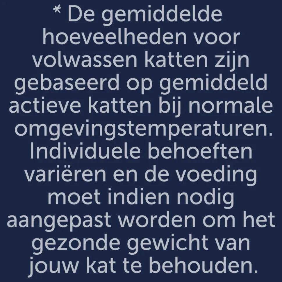 *De gemiddelde hoeveelheden voor volwassen katten zijn gebaseerd op gemiddeld actieve katten bij normale omgevingstemperaturen. Individuele behoeften variëren en de voeding moet indien nodig worden aangepast om jouw kat op een slank, gezond lichaamsgewicht te houden.