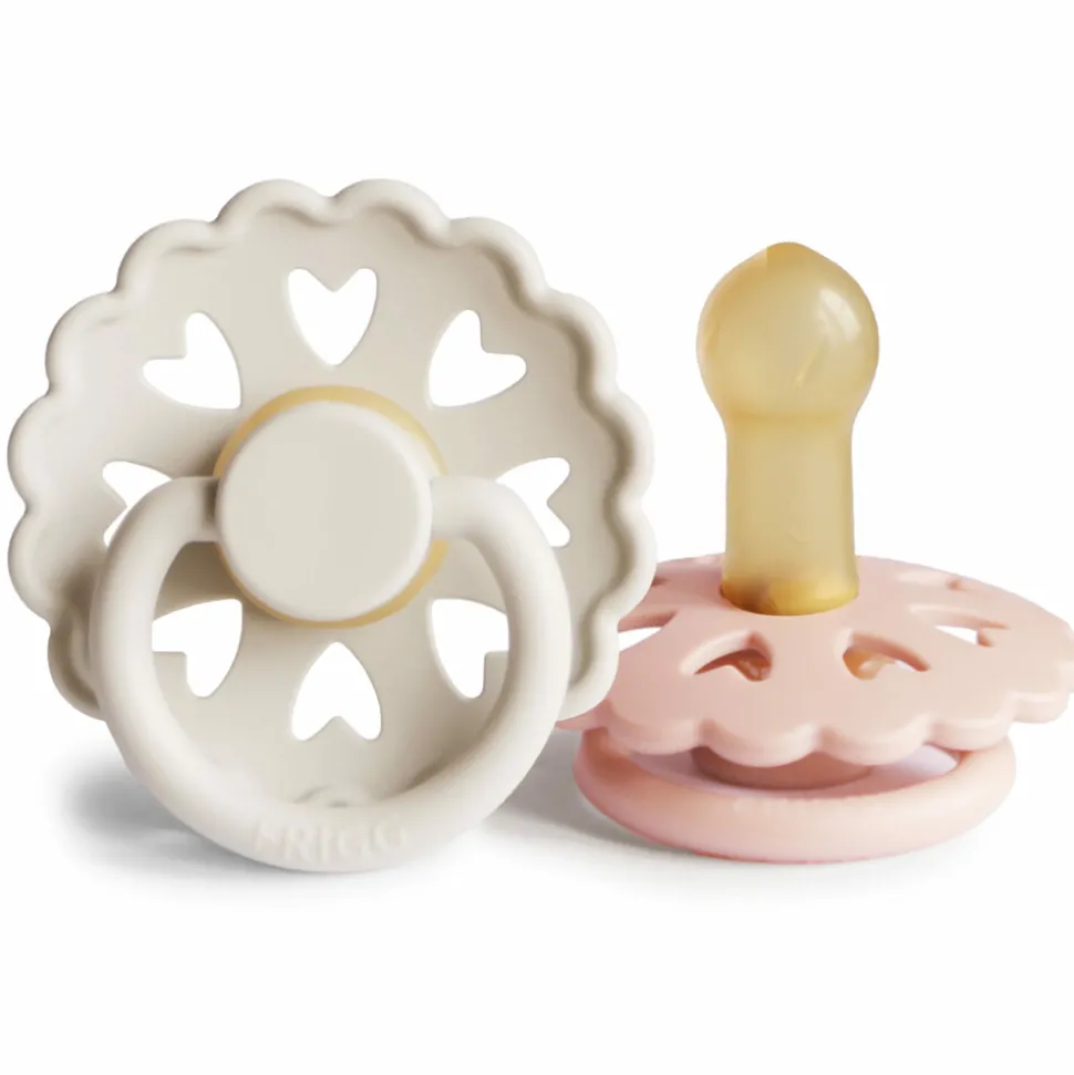 Frigg heeft hun nieuwe collectie gebaseerd op de 9 sprookjes van Hans Christian Andersen. Hans Christian Andersen was niet alleen een goede verhalen verteller, maar hij maakte ook de mooiste motieven uit papier. Het hartje wat je ziet in deze nieuwe speen komt uit zijn gesneden kunstwerken. Elk sprookje heeft overigens zijn eigen kleur. De spenen hebben een naar buiten gebogen schild met gaatjes in de vorm van hartjes. Zo maakt het schild minimaal contact met de babyhuid.
