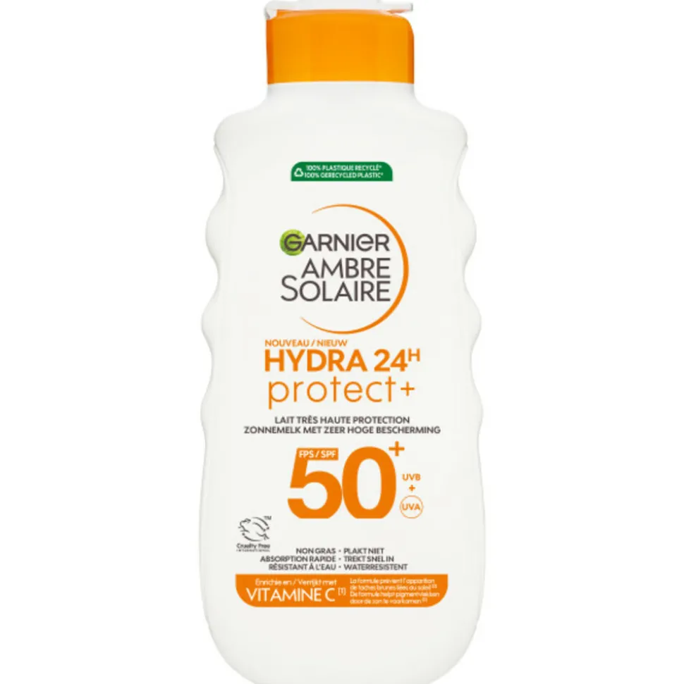 Ambre Solaire Hydra 24H Protect SPF 50+ is een zonnebrandcrème met vitamine Cg die zeer hoge bescherming biedt tegen UVA- en UVB-stralen. De beschermende zonnemelk helpt tekenen van huidveroudering door de zon te voorkomen en hydrateert 24 uur lang.