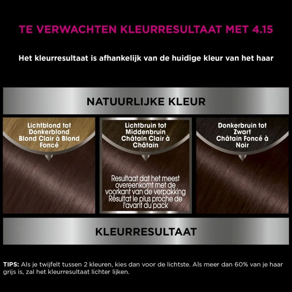 1257558 E – KLEURCRÈME: / CRÈME COLORANTE:PARAFFINUM LIQUIDUM/ MINERAL OIL, AQUA/ WATER, ETHANOLAMINE, DECYL GLUCOSIDE, SODIUM LAURYL SULFATE, PEG-40 HYDROGENATED CASTOR OIL, m-AMINOPHENOL, 2-AMINO-3-HYDROXYPYRIDINE, 4-AMINO-2-HYDROXYTOLUENE, ASCORBIC ACID, TOCOPHEROL, HYDROXYPROPYL GUAR, HYDROXYBENZOMORPHOLINE, SODIUM METABISULFITE, HYDROXYETHYL-3,4-METHYLENEDIOXYANILINE HCL, 6-HYDROXYINDOLE, THIOGLYCERIN, TOLUENE-2,5-DIAMINE, HELIANTHUS ANNUUS SEED OIL/ SUNFLOWER SEED OIL, CAMELLIA OLEIFERA SEED OIL, DISODIUM COCOAMPHODIACETATE, EDTA, 2,4-DIAMINOPHENOXYETHANOL HCL, PARFUM/ FRAGRANCE.1190229 – ONTWIKKELCRÈME: / LAIT RÉVÉLATEUR:AQUA/ WATER, PARAFFINUM LIQUIDUM/ MINERAL OIL, HYDROGEN PEROXIDE, CETEARYL ALCOHOL, SODIUM CETEARYL SULFATE, SODIUM SALICYLATE, SODIUM SULFATE, PEG-40 HYDROGENATED CASTOR OIL, PHOSPHORIC ACID, TETRASODIUM ETIDRONATE, TETRASODIUM PYROPHOSPHATE. 1119728 – VERZORGENDE NABEHANDELING: / SOIN:AQUA/ WATER, CETEARYL ALCOHOL, BEHENTRIMONIUM CHLORIDE, CETYL ESTERS, CAMELLIA OLEIFERA SEED OIL, HELIANTHUS ANNUUS SEED OIL/ SUNFLOWER SEED OIL, COCOS NUCIFERA OIL/ COCONUT OIL, DILAURYL THIODIPROPIONATE, POTASSIUM HYDROXIDE, ISOPROPYL ALCOHOL, TOCOPHEROL, BENZOIC ACID, PARFUM/ FRAGRANCE.