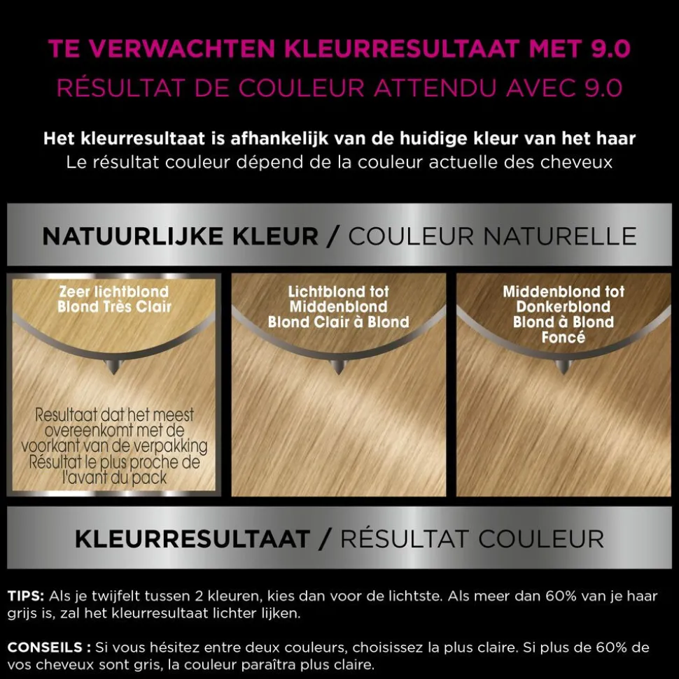 1257502 C – KLEURCRÈME: / CRÈME COLORANTE:PARAFFINUM LIQUIDUM / MINERAL OIL • AQUA / WATER • ETHANOLAMINE • DECYLGLUCOSIDE • SODIUMLAURYLSULFATE •PEG-40HYDROGENATEDCASTOR OIL • m-AMINOPHENOL • 2-AMINO-3-HYDROXYPYRIDINE • ASCORBIC ACID • TOCOPHEROL • HYDROXYPROPYLGUAR • HYDROXYBENZOMORPHOLINE • SODIUMMETABISULFITE • HYDROXYETHYL- 3,4 – METHYLENEDIOXYANILINE HCL • 6 – HYDROXYINDOLE • THIOGLYCERIN • TOLUENE-2,5-DIAMINE • HELIANTHUS ANNUUS SEED OIL / SUNFLOWER SEED OIL • CAMELLIA OLEIFERA SEED OIL • N,N-BIS(2-HYDROXYETHYL)-p-PHENYLENEDIAMINE SULFATE • DISODIUM COCOAMPHODIACETATE • EDTA • 2,4-DIAMINOPHENOXYETHANOL HCL • PARFUM / FRAGRANCE. 1187179 A – ONTWIKKELCRÈME: / LAIT RÉVÉLATEUR:AQUA/ WATER, PARAFFINUM LIQUIDUM/ MINERAL OIL, HYDROGEN PEROXIDE, CETEARYL ALCOHOL, SODIUM CETEARYL SULFATE, SODIUM SALICYLATE, SODIUM SULFATE, PEG-40 HYDROGENATED CASTOR OIL, PHOSPHORIC ACID, TETRASODIUM ETIDRONATE, TETRASODIUM PYROPHOSPHATE.1119728 B – VERZORGENDE NABEHANDELING/ SOIN:AQUA/ WATER, CETEARYL ALCOHOL, BEHENTRIMONIUM CHLORIDE, CETYL ESTERS, CAMELLIA OLEIFERA SEED OIL, HELIANTHUS ANNUUS SEED OIL/ SUNFLOWER SEED OIL, COCOS NUCIFERA OIL/ COCONUT OIL, DILAURYL THIODIPROPIONATE, POTASSIUM HYDROXIDE, ISOPROPYL ALCOHOL, TOCOPHEROL, BENZOIC ACID, PARFUM/ FRAGRANCE.